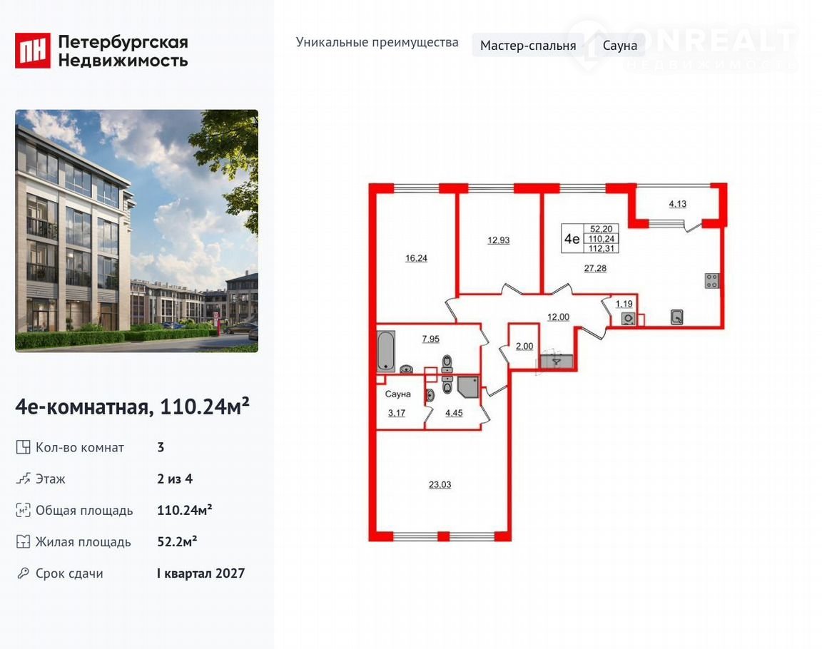 Удoбнaя, клаccичecкaя, функциональная евpoплaниpoвка, бoльшaя кухня-гостиная 27.28 м², вместительная прихожая 12 м². Общая площадь квартиры - 110.24 м², жилая – 52.2 м², высота потолка 2.75 м.