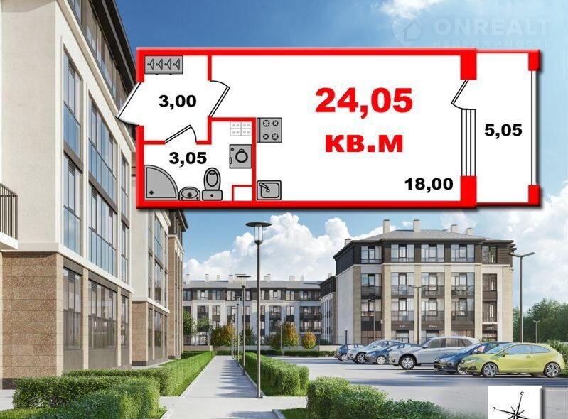 Квартира студия, 24.1 м2, этаж 1 / 4, на продажу в посёлке Стрельна, проспект Будённого, 18к3