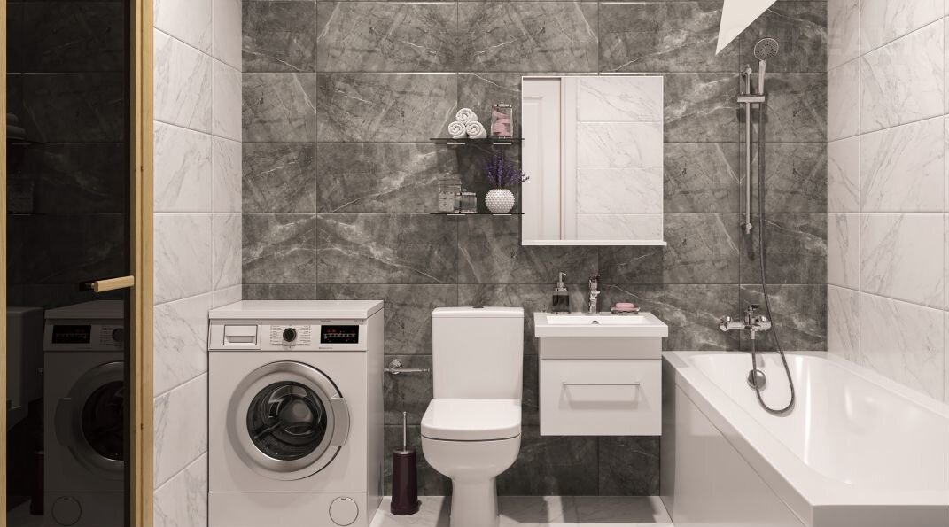 - справа от входа расположен совмещенный санузел (3,05 кв.м), где в добавление к сантехнике от застройщика, найдется место и под стиральную машину;
