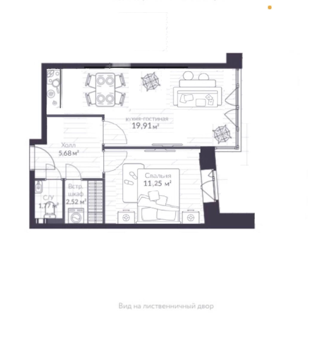 одна комната (гостиная) совмещена с кухней (19.91 кв.м.).