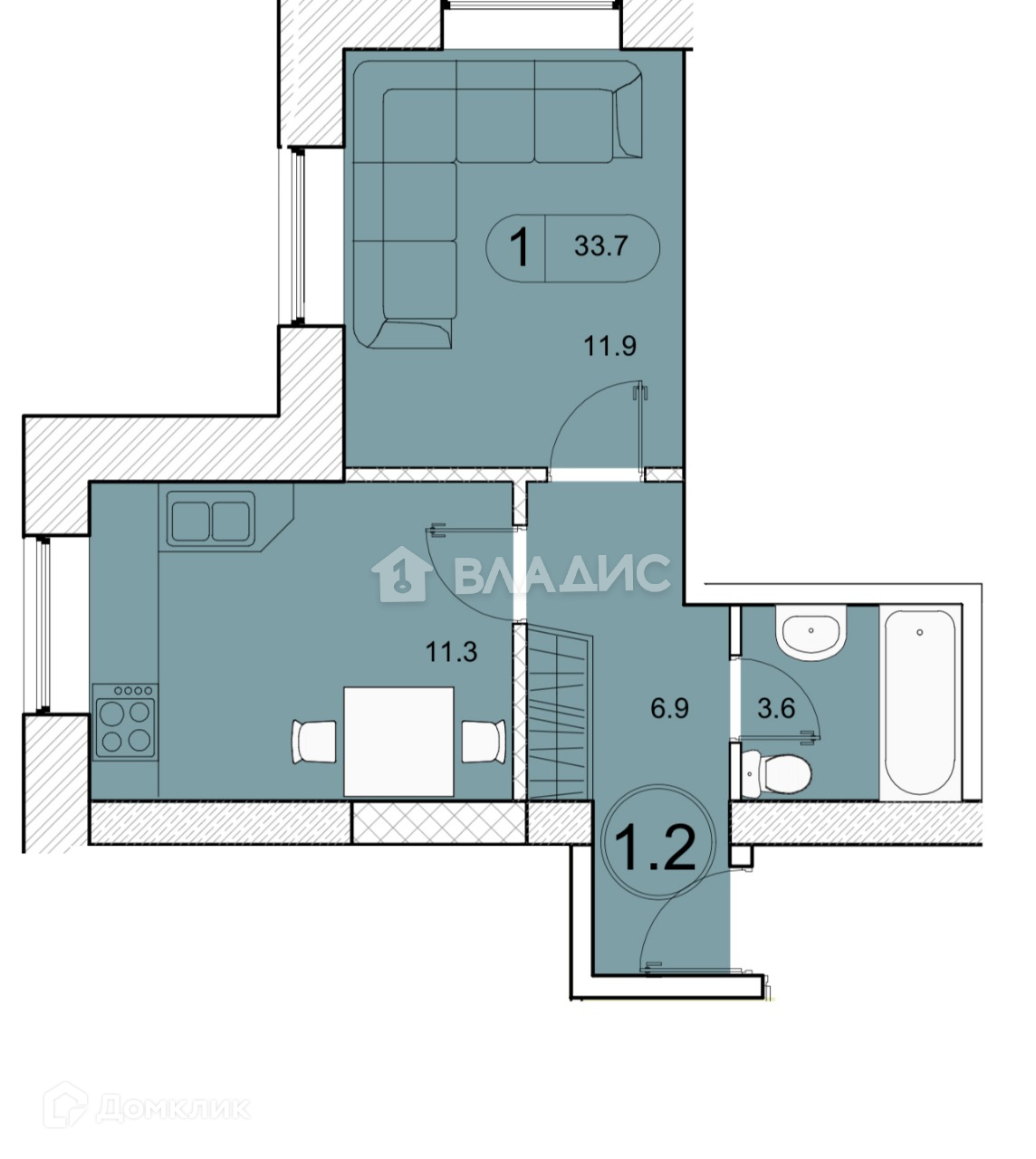 Общая площадь 33.7 м2