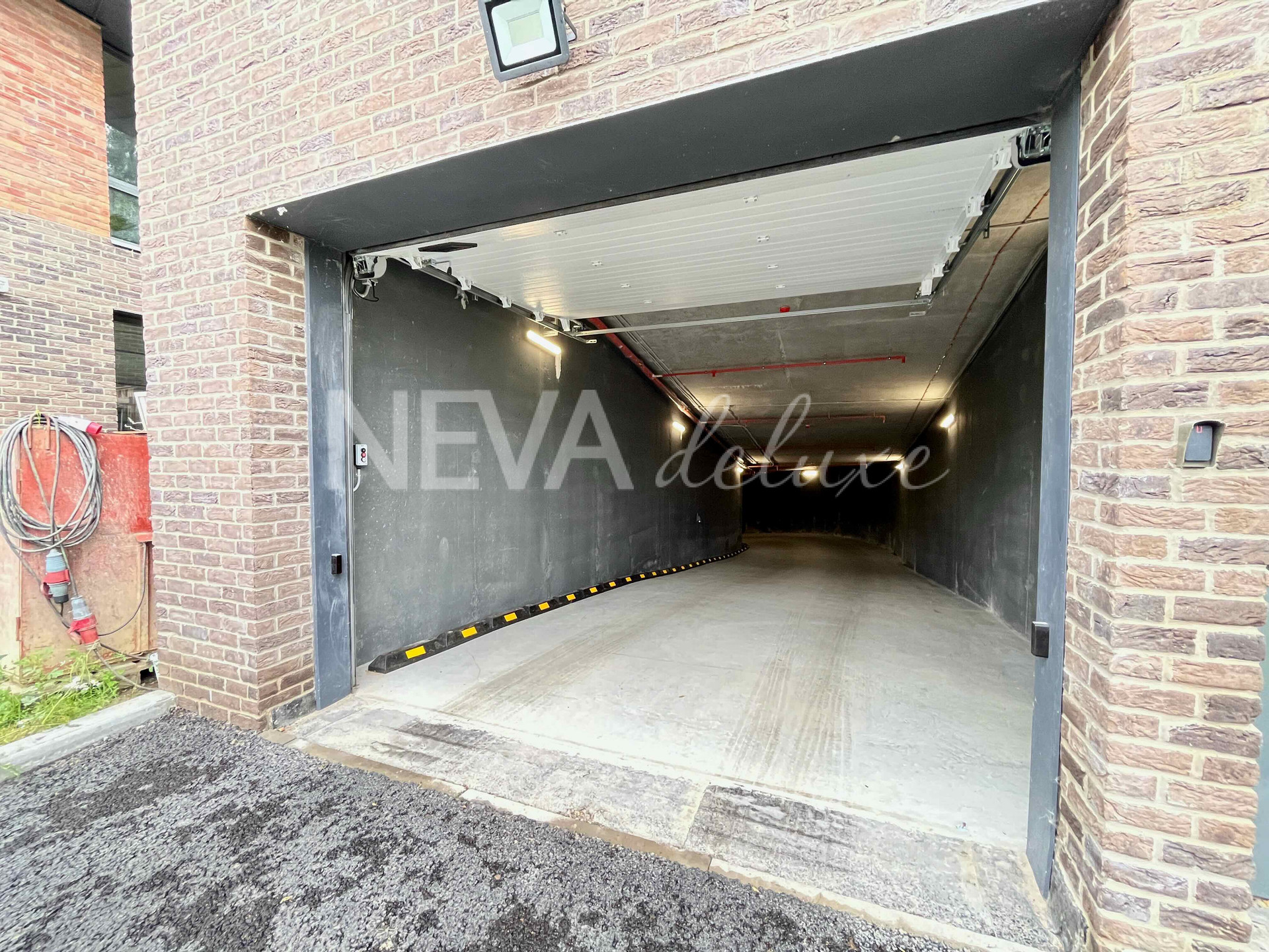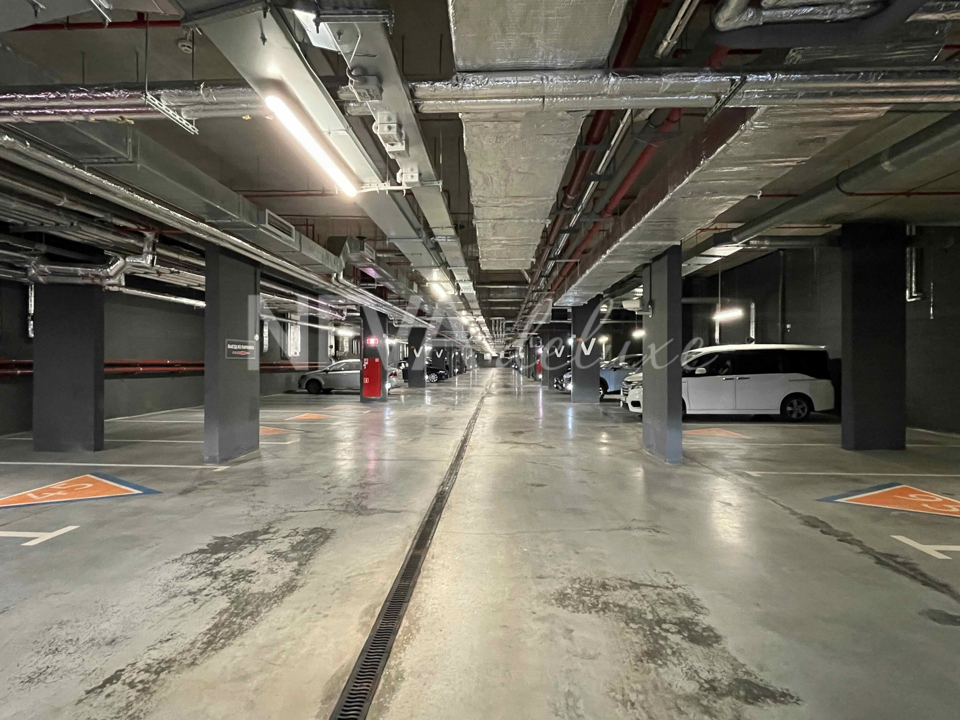 Удобный широкий въезд в паркинг, высокие потолки,  большое пространство до соседнего парковочного места
