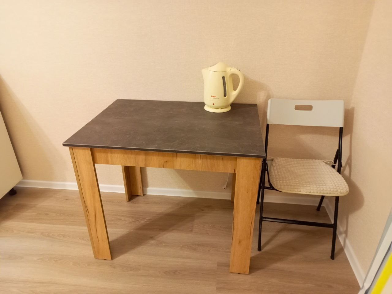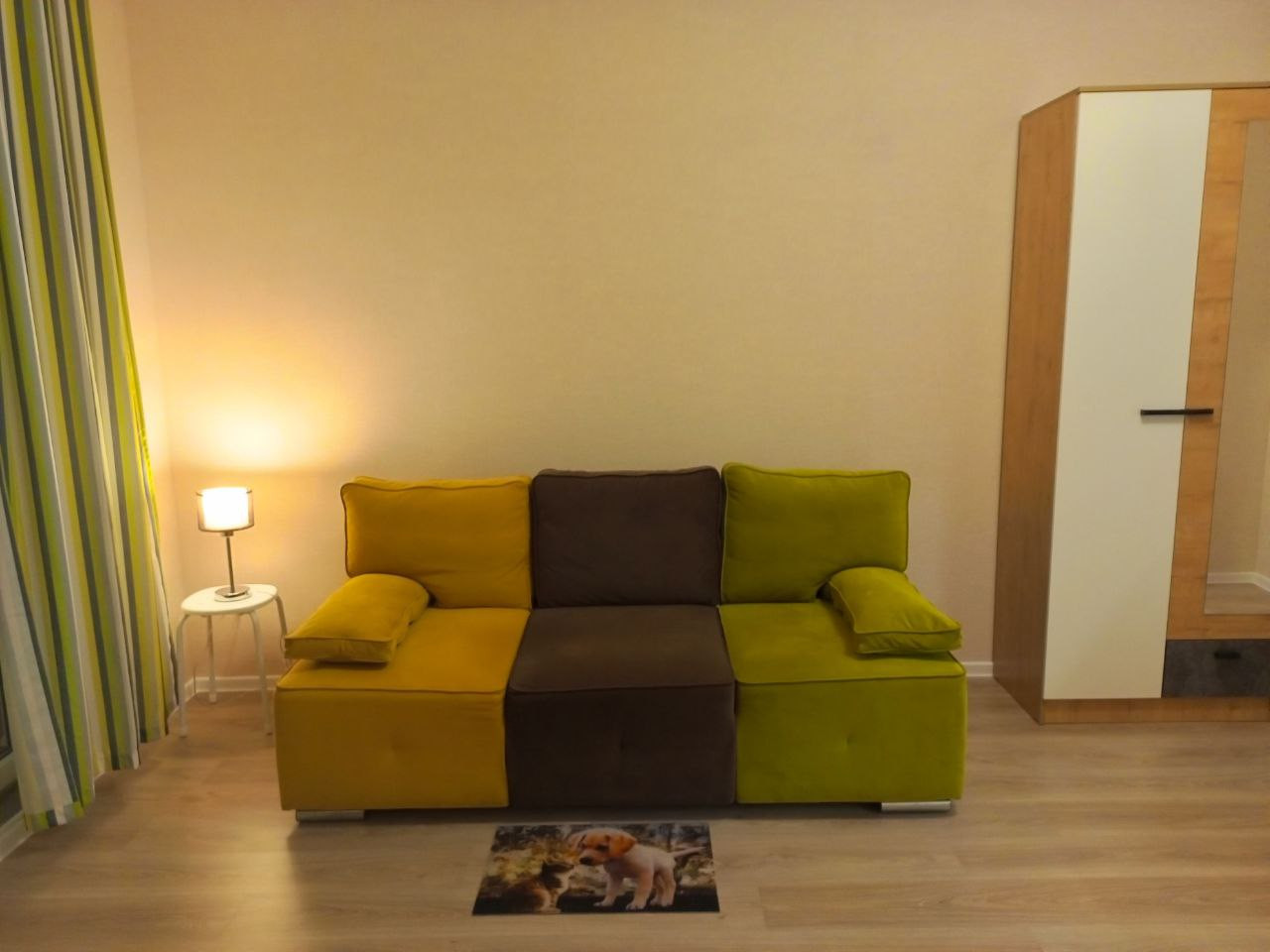 В квартире есть все необходимое для жизни: диван, шкаф, холодильник, стиральная машинка, индукционная плита, микроволновка.