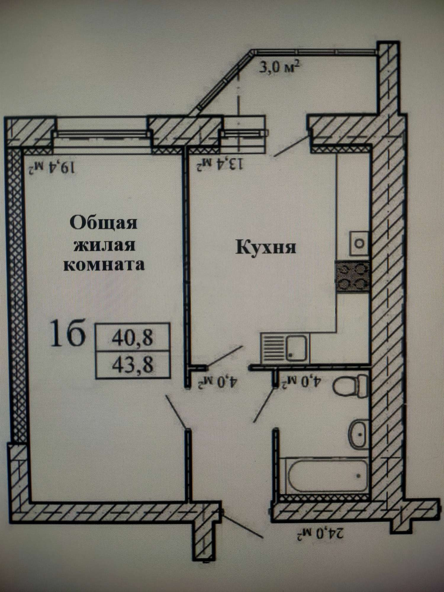 Общая площадь 43,8 кв.м., жилая площадь 19,4 кв.м., кухня 13,4 кв.м.,