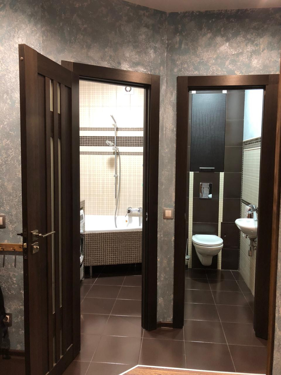 Пол квартиры организован в одном уровне, с зонами "тёплого пола". Стены - декоративная штукатурка и обои из натурального бамбука и декоративной плитки.