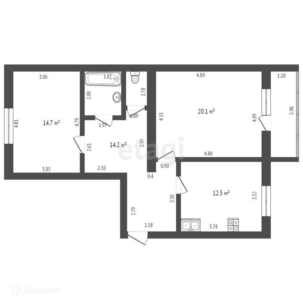 Площадь двухкомнатной квартиры 66.9 м2. Две большие изолированные комнаты, квадратной формы кухня и просто огромной площади коридоры. И еще есть огромный плюс - в этой квартире высота потоков 280 см. что делает ее еще более просторной и объемной.