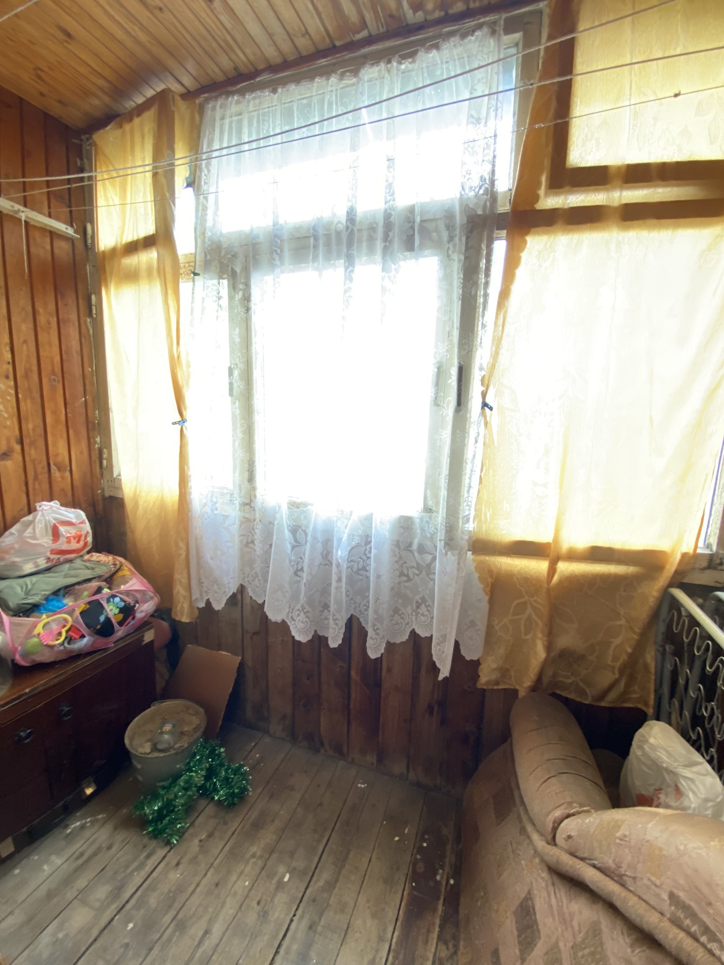 Есть балкон, застеклен деревом.