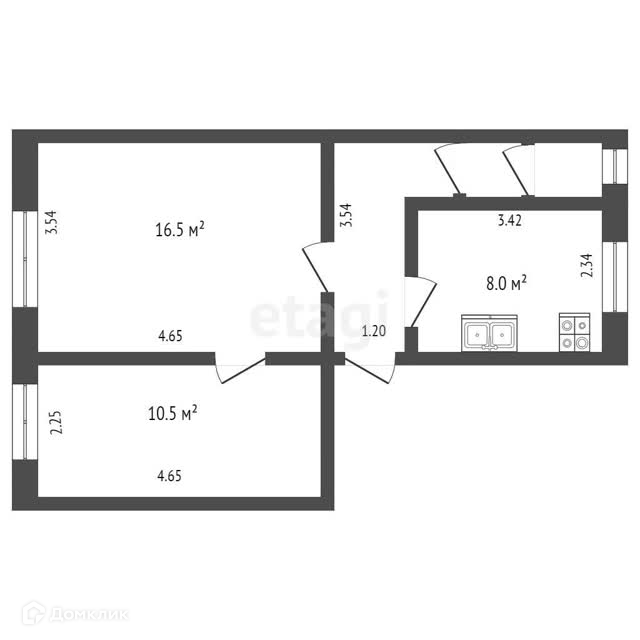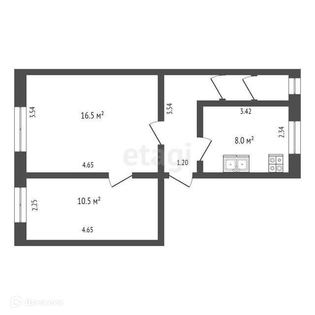 Общая площадь квартиры 42,4 м2. Состоит из двух комнат правильной формы площадью 10,5 и 16,5 м2.