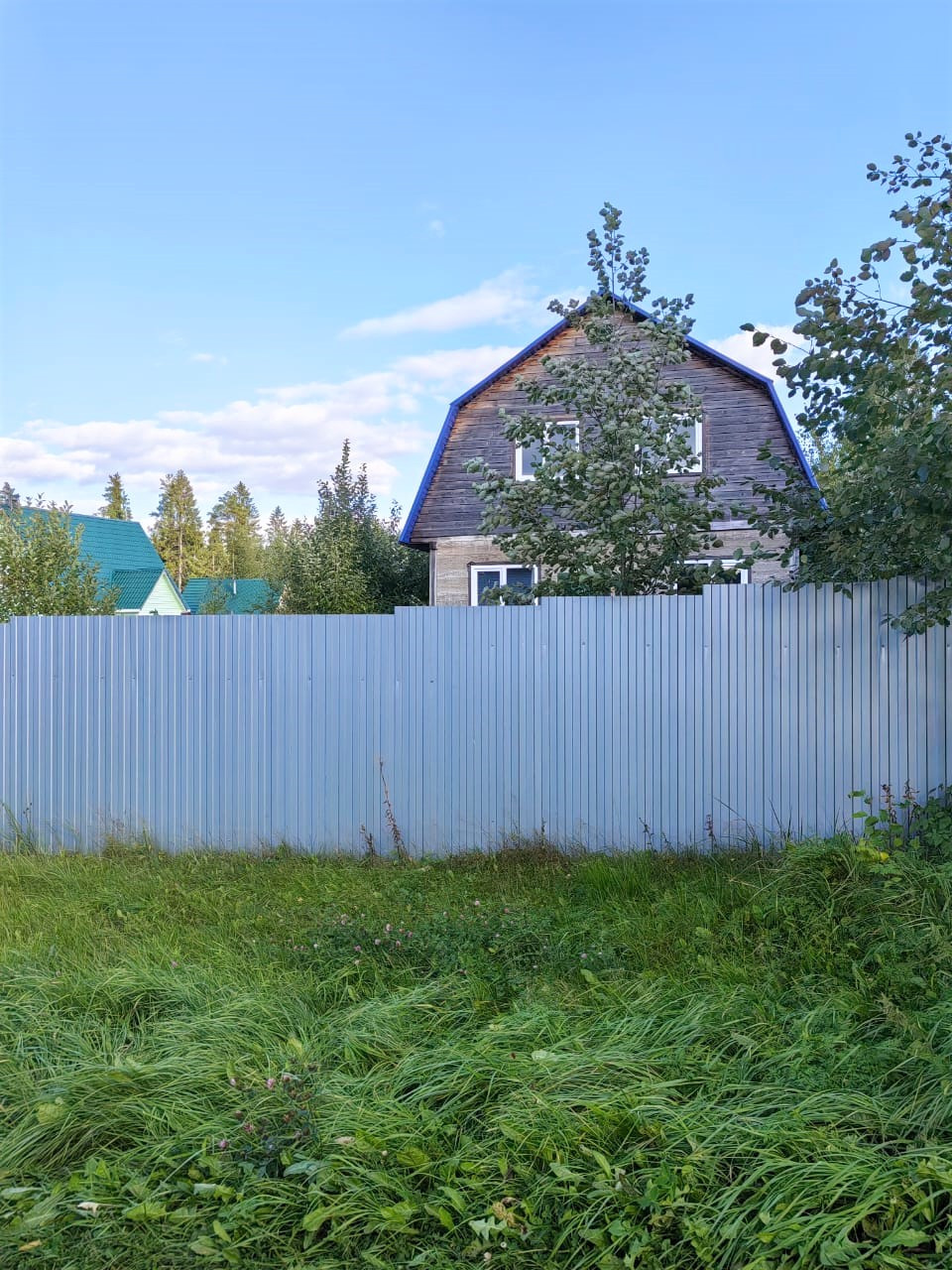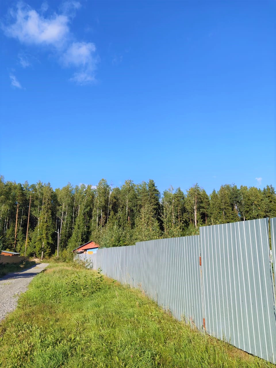 Участок 15 соток. С двух сторон обнесен железным забором. Сделана калитка.