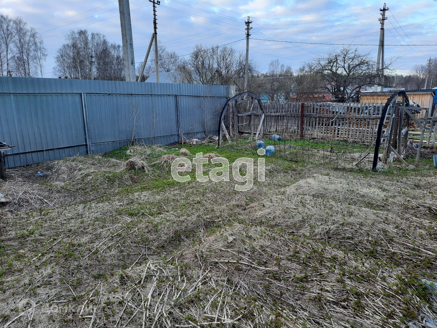 Есть небольшой земельный участок, с каркасом теплицы, и собственным колодцем, всё огорожено забором из профнастила.