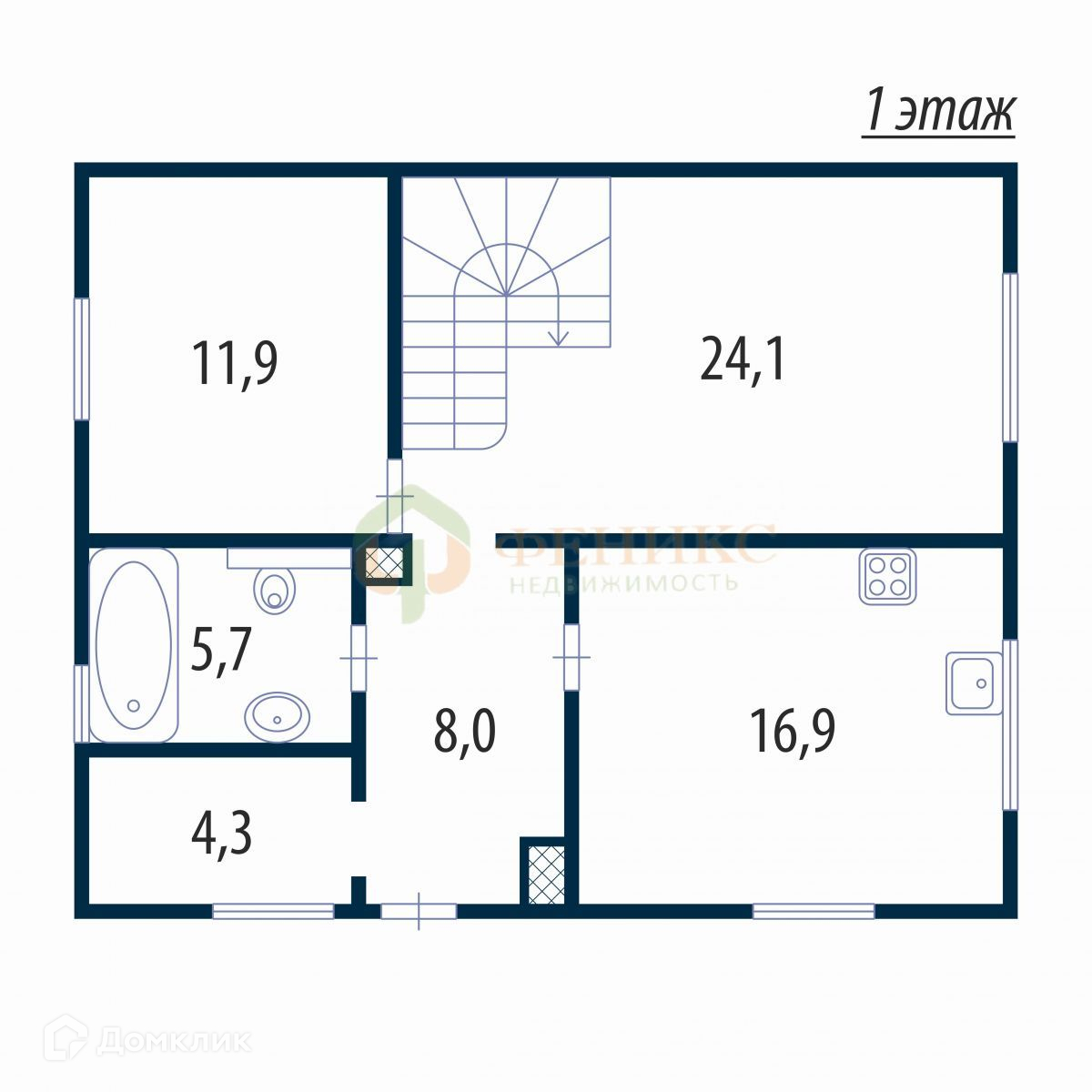 1 этаж - Холл, Котельная , спальня, кухня, гостиная, санузел.
