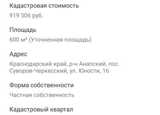Земельный участок 6 соток, п.Суворово-Черкесский, 25 мин до Анапы и 10 мин до моря. КОММУНИКАЦИИ: -- свет, вода проходят по меже участка. — газ в перспективе. Преимущество покупки этого земельного участка: -- Хорошие подъездные пути, дорога отсыпана. -- рядом жилые постройки. — есть разрешение на строительство дома. -- Все документы на землю получены... |