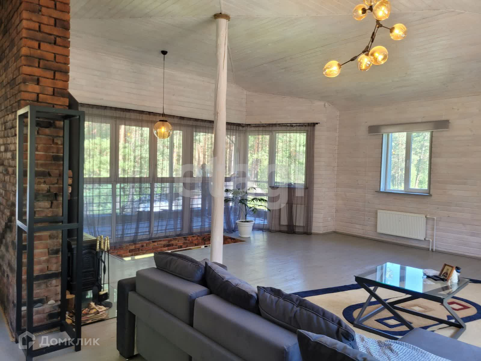 На втором этаже: зал-гостиная 62 кв.м. с камином и терраса с видом на лес.