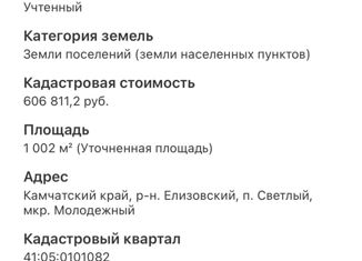 Продаётся участок под ИЖС, 12 соток, от собственника. Адрес Камчатский край, р-н. Елизовский, п. Светлый, мкр. Молодежный 298. Кадастровый номер 41:05:0101082:131. Прямо через дорогу строится краевая больница, в перспективе район будет популярен. |