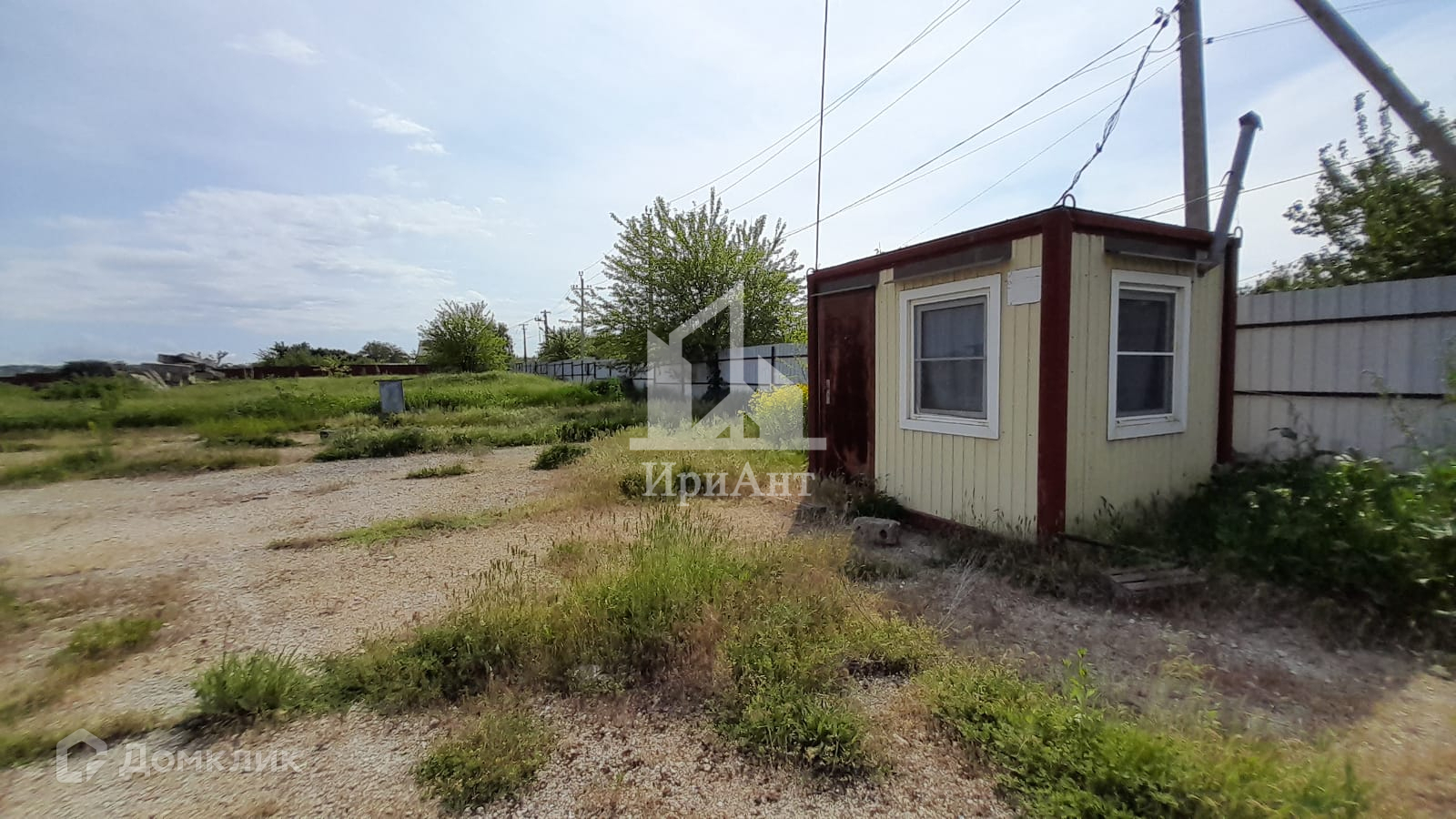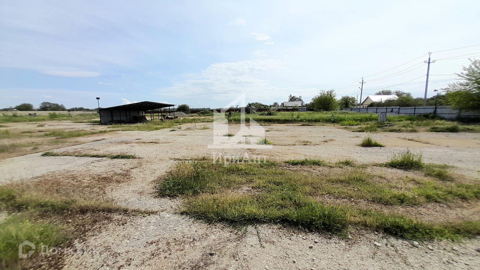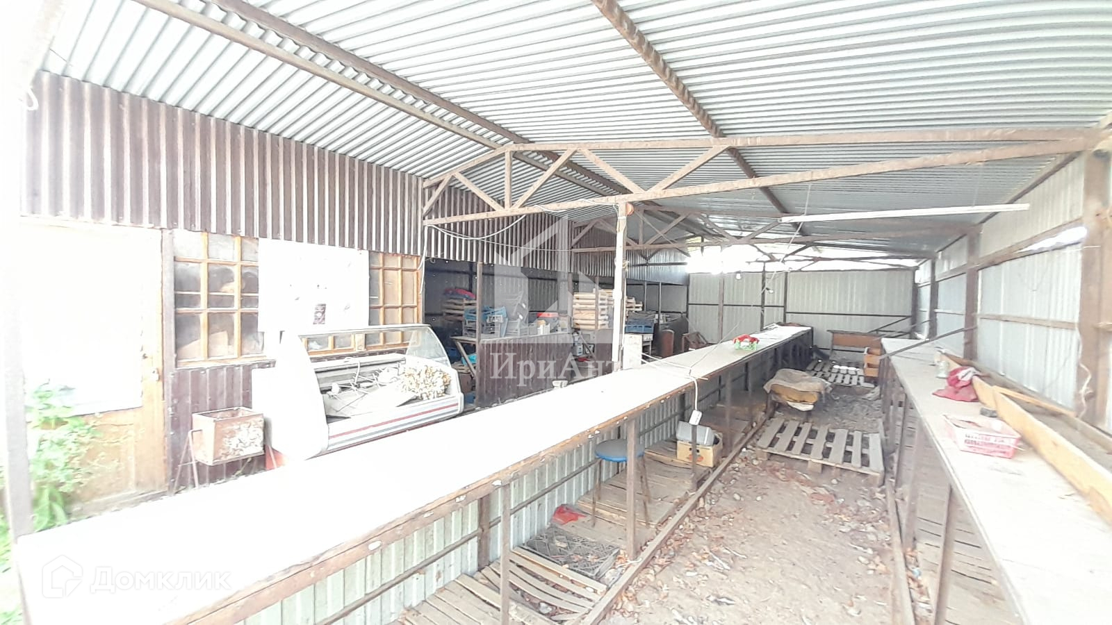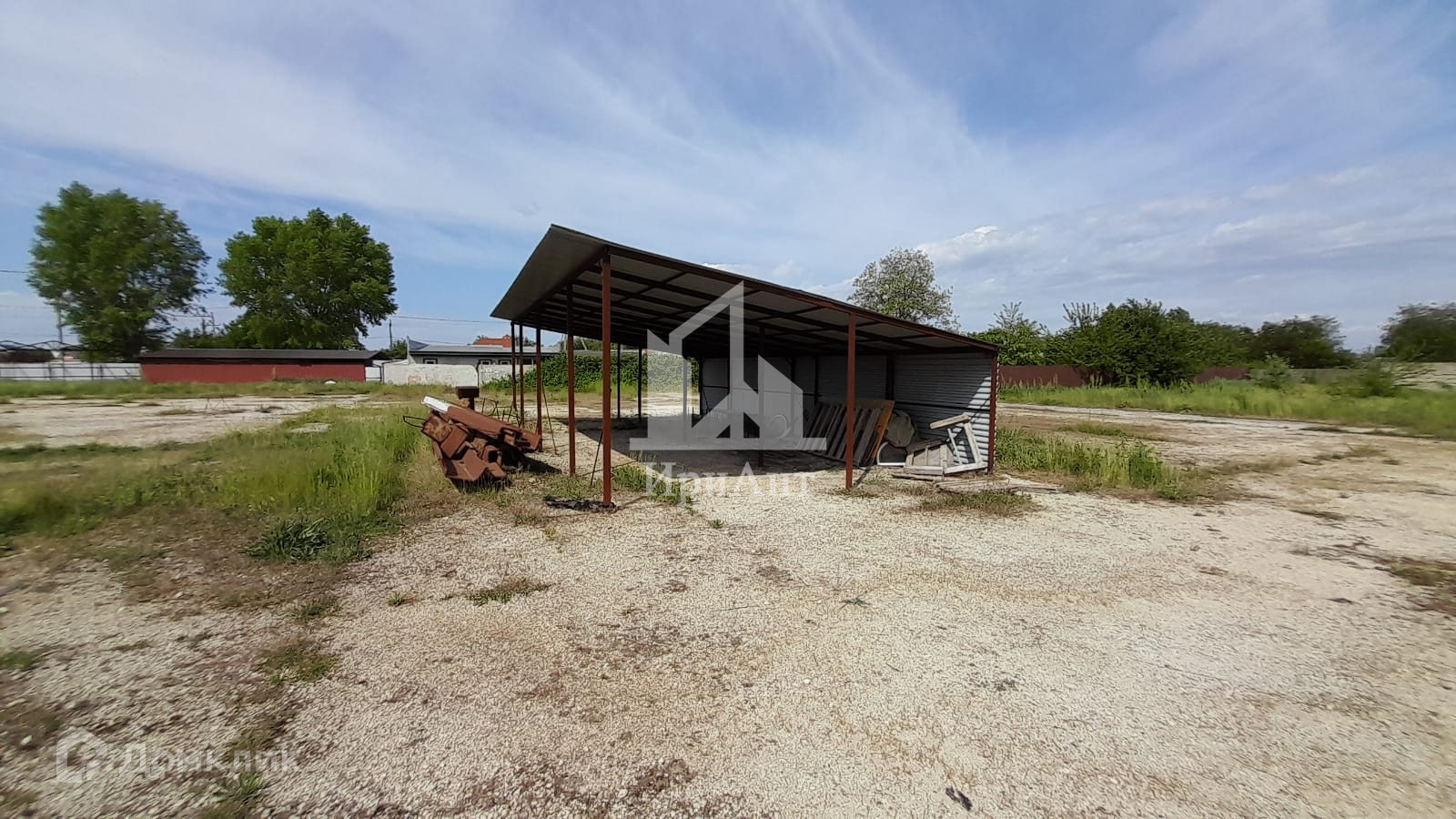 Территория забетонирована, по всему периметру установлен забор из металлопрофиля. Есть строение для охраны и навес. Также со стороны фасада на участке имеется помещение из профнастила для торговли.