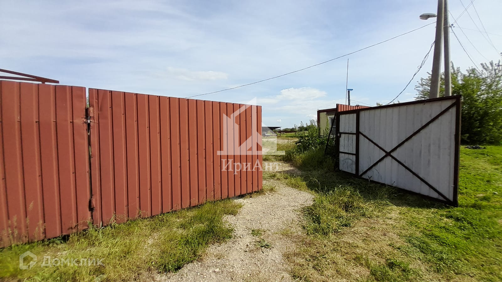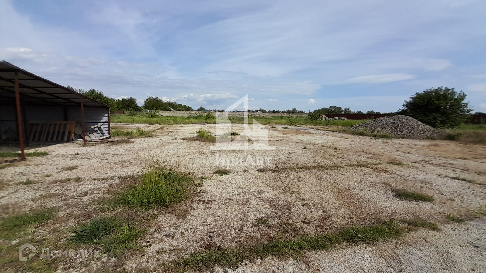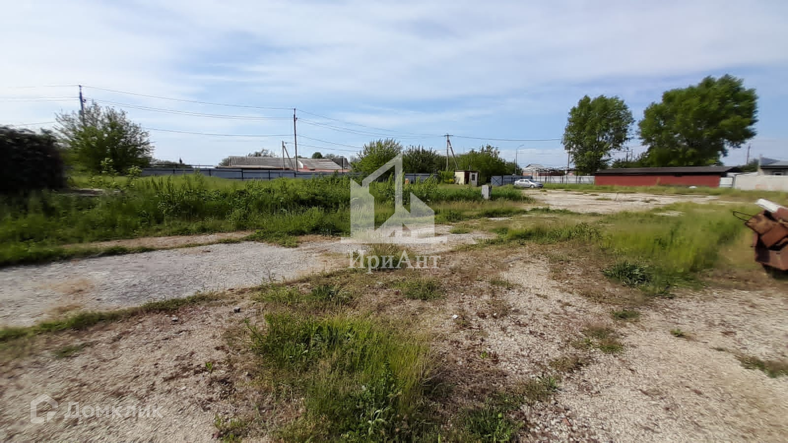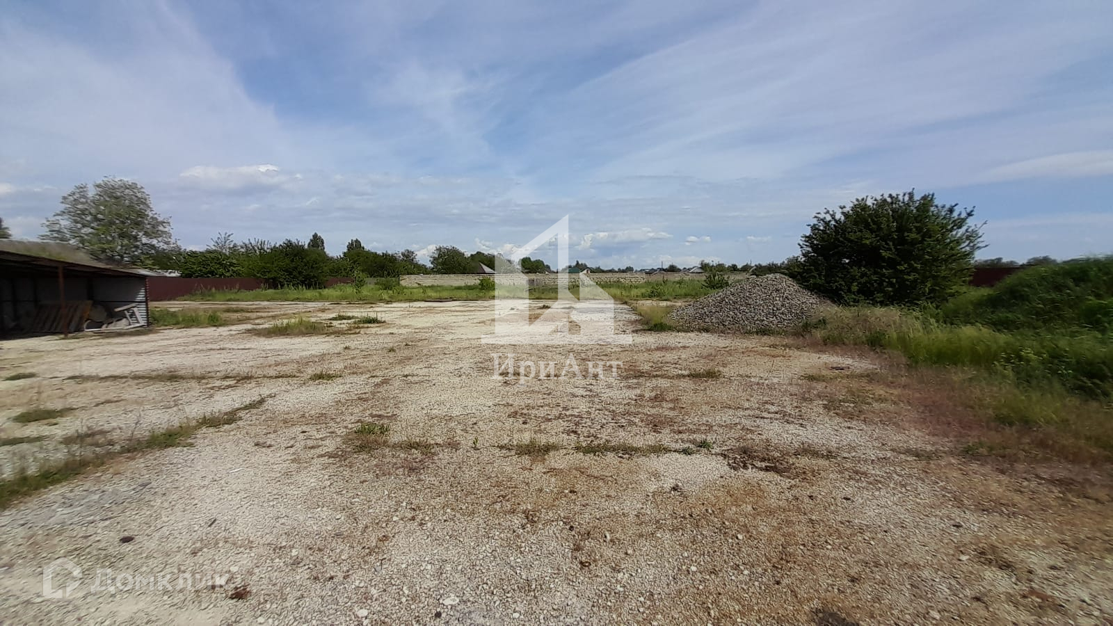 Территория забетонирована, по всему периметру установлен забор из металлопрофиля. Есть строение для охраны и навес. Также со стороны фасада на участке имеется помещение из профнастила для торговли.