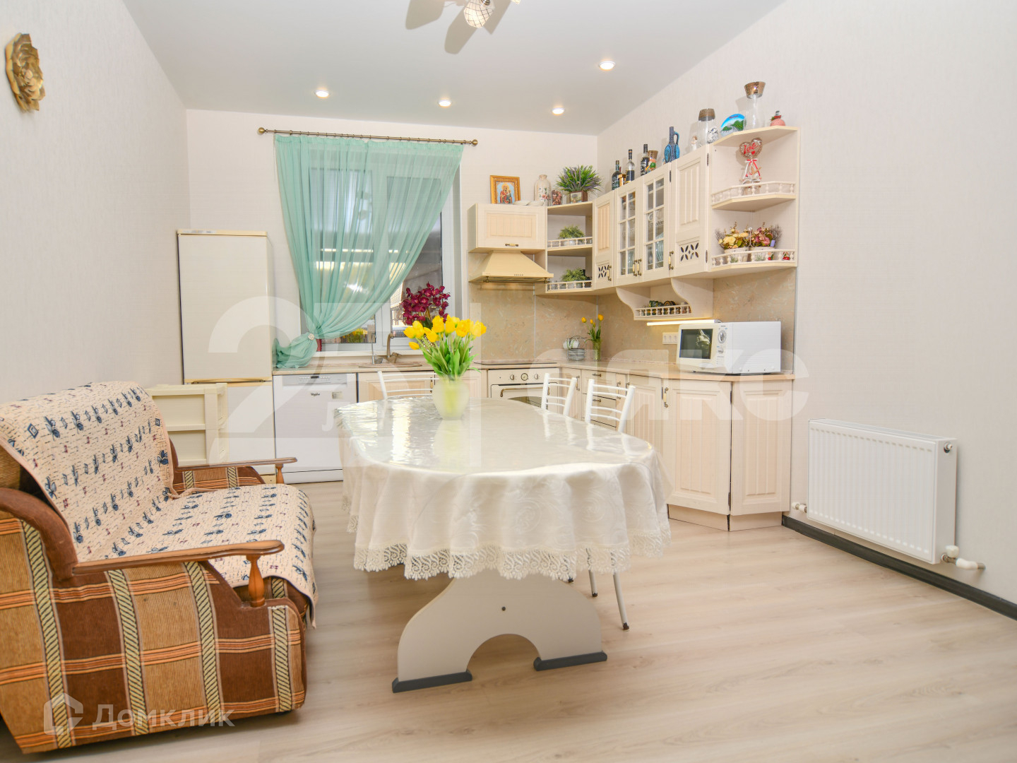 Выполнен качественный ремонт. Делали для себя. Высокие потолки и окна наполняют пространство светом. Просторная кухня-гостиная  предлагает Вам место для творчества и вдохновения, а также оснащена всем необходимым оборудованием.