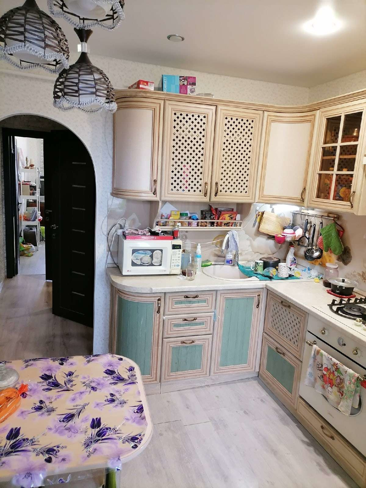 Кухня: Красивый угловая кухня остается, с фартуком и встроенной плитой, натяжной потолок, с выходом на лоджию.