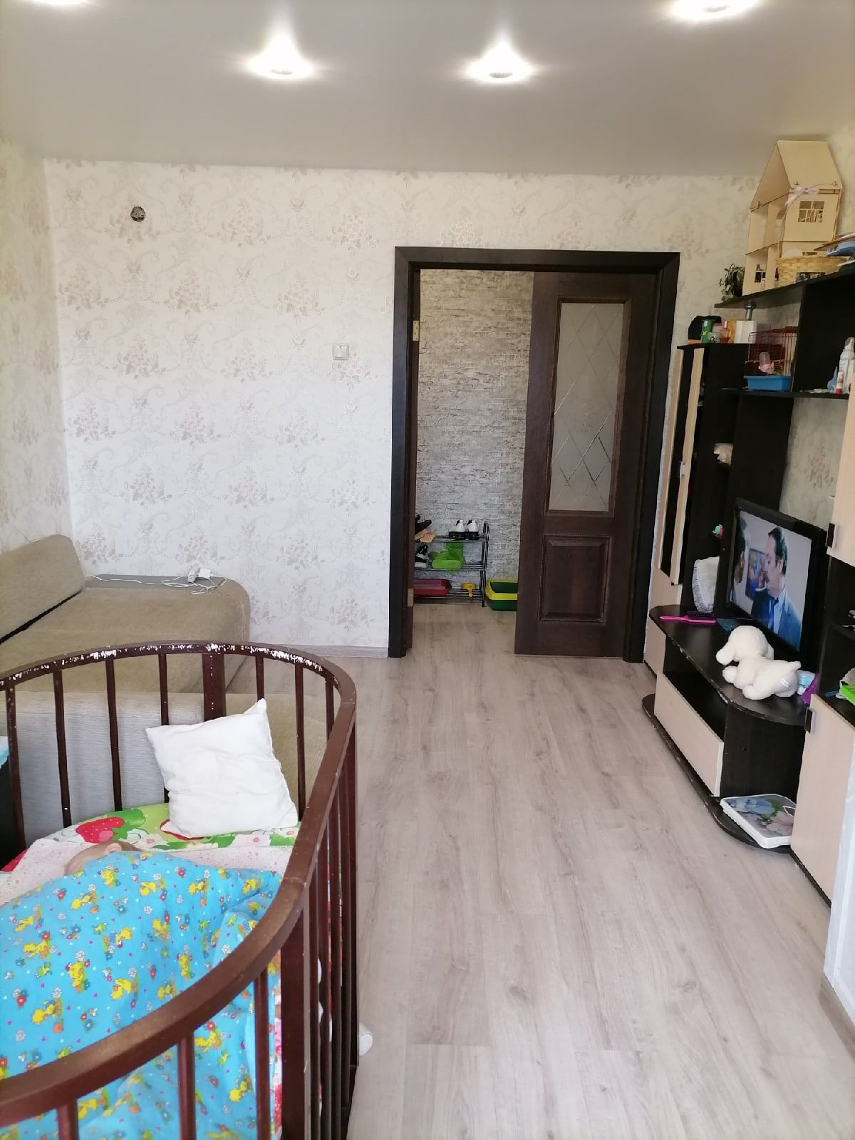 Комнаты, коридор: ремонт 2 года назад. Полы сделаны в один уровень, в одной комнате и коридор по технологии "Суперпол" - керамзит + плиты кнауф + подложка + ламинат, в другой сделана стяжка. Натяжные потолки белые, обои светлые. Широкие подоконники. Биметаллические радиаторы.