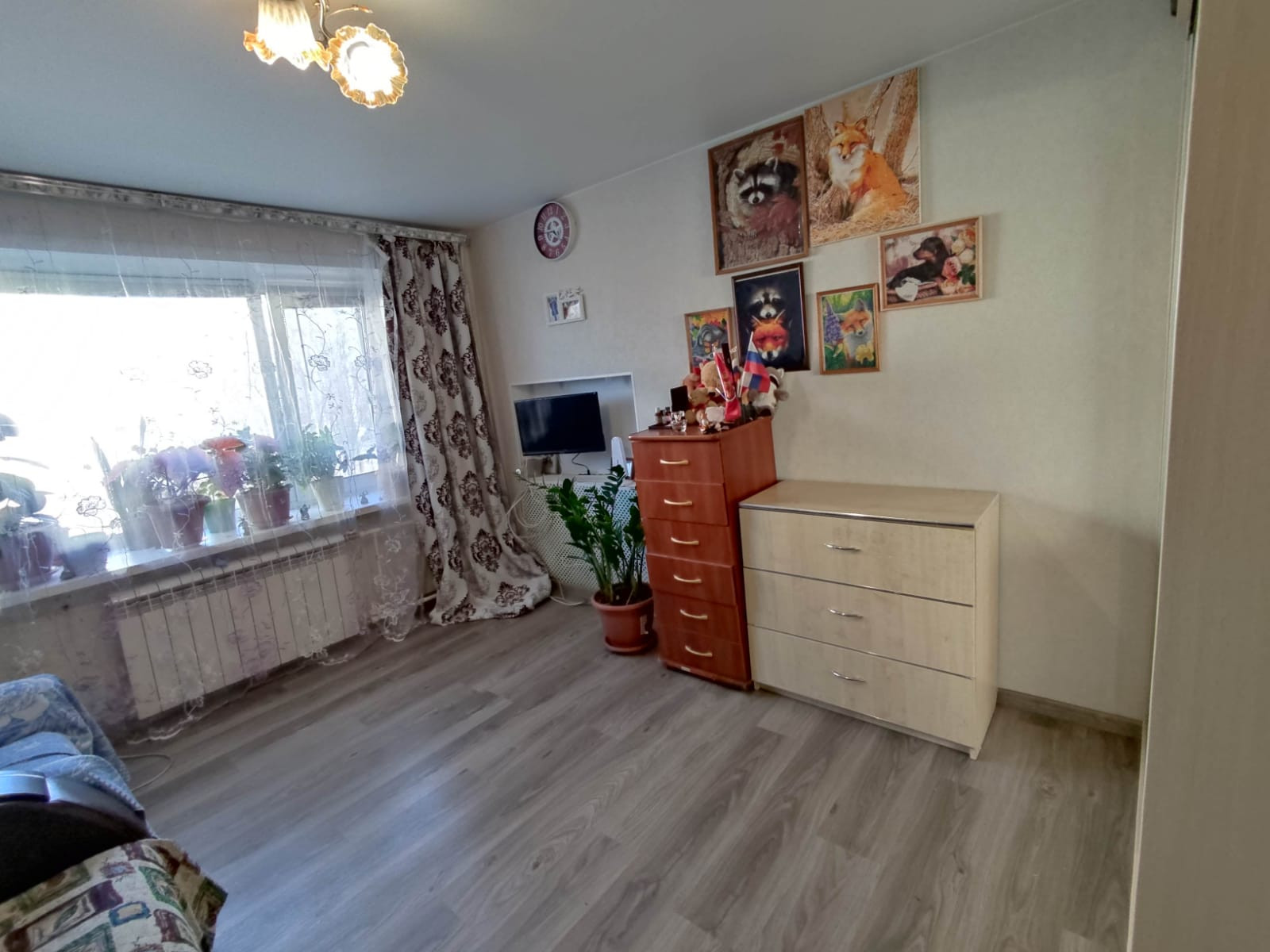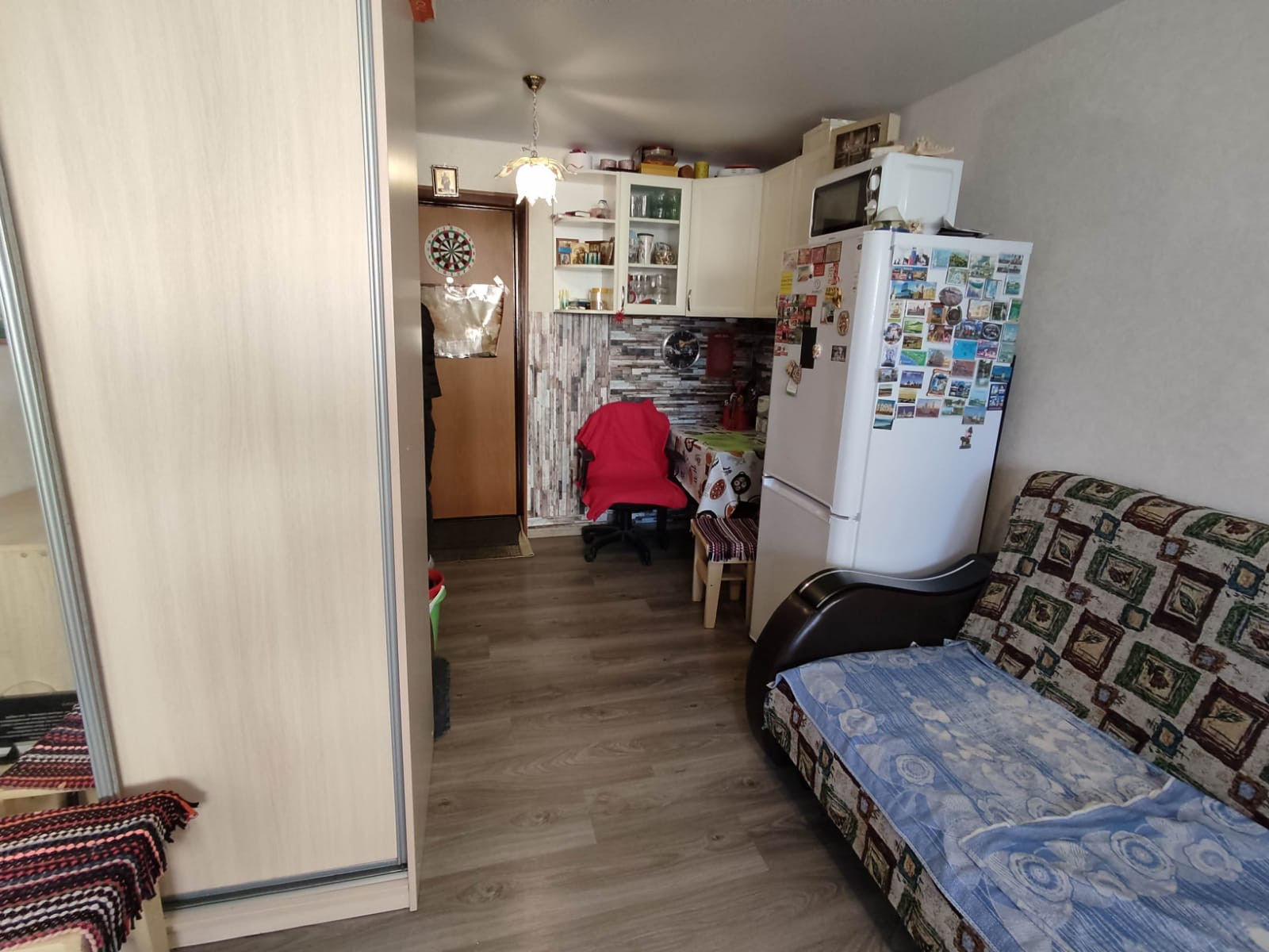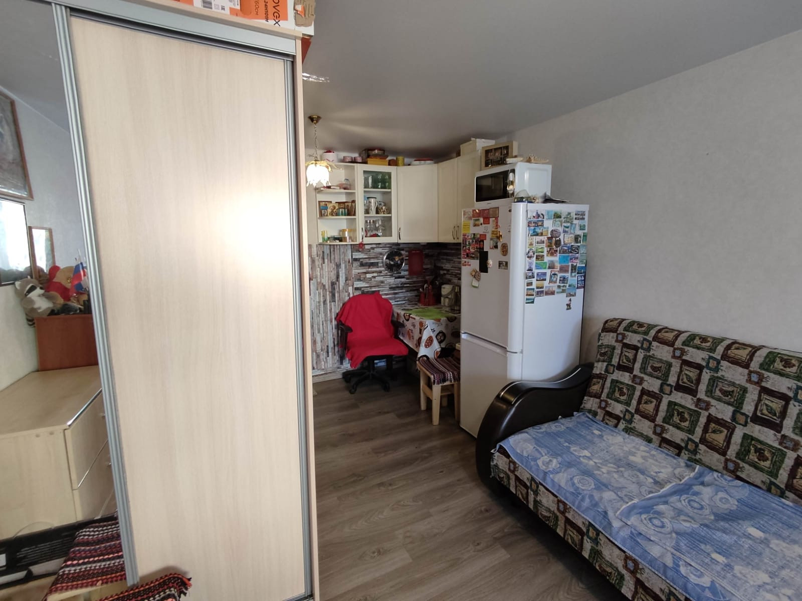 В комнате сделан косметический ремонт: установлено пластиковое окно, на полу ламинат, натяжной потолок, стены выровнены. Остается встроенная кухня. Соседи спокойные.