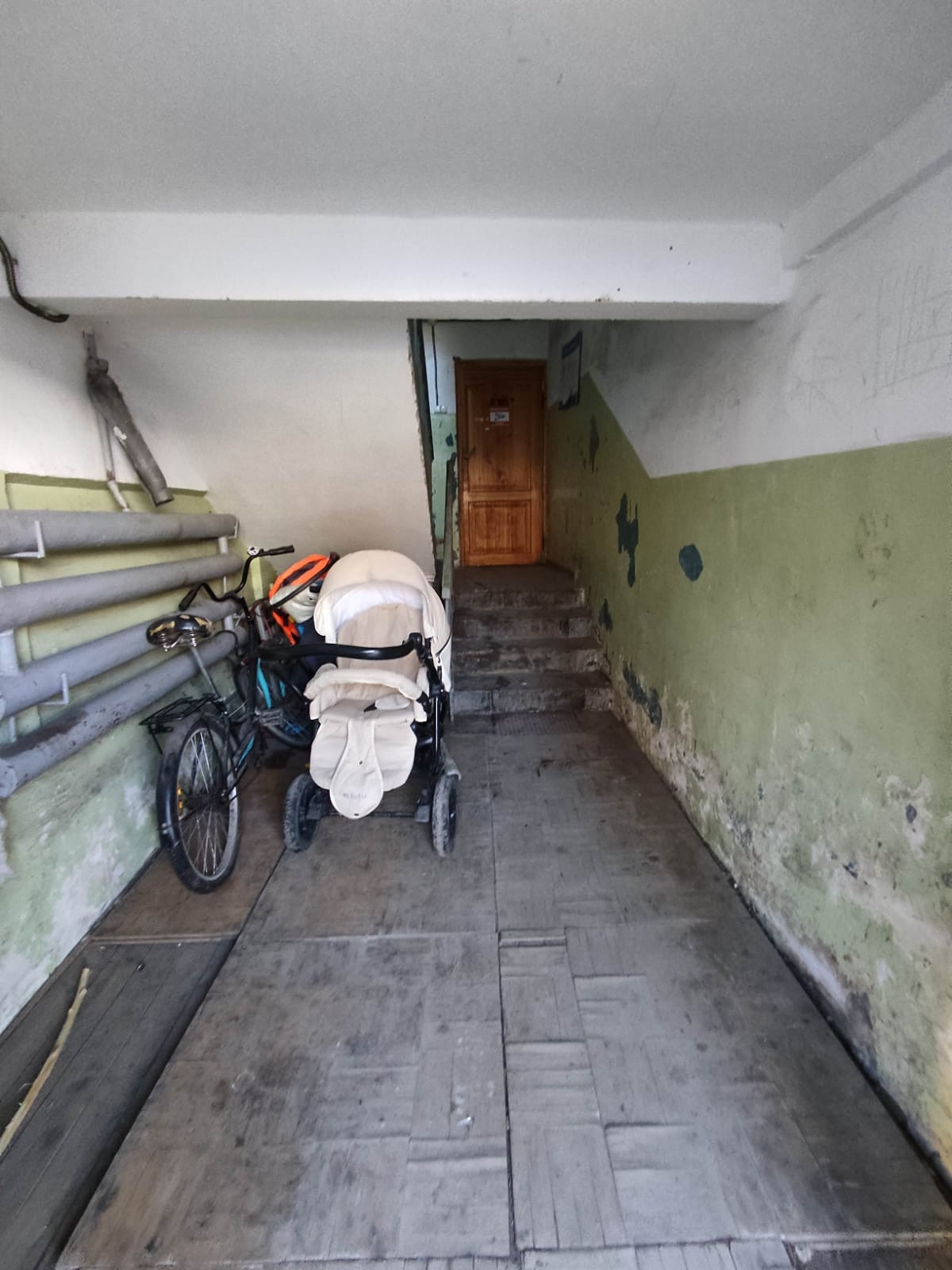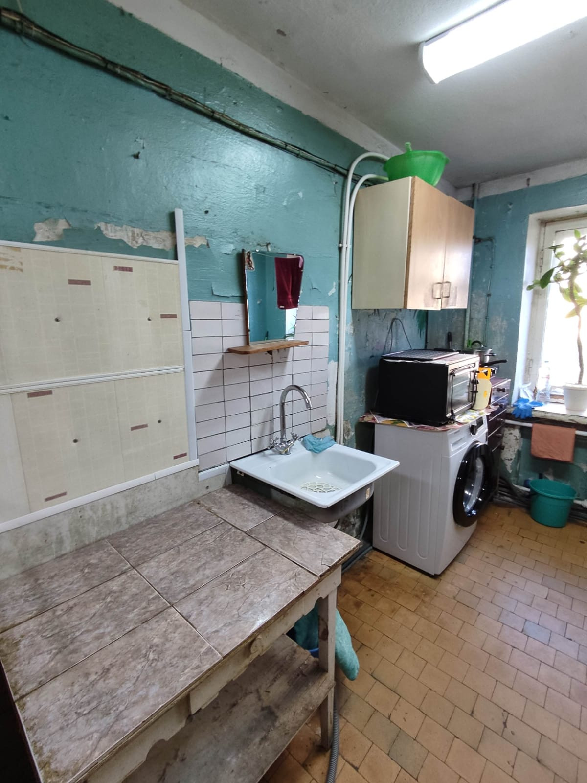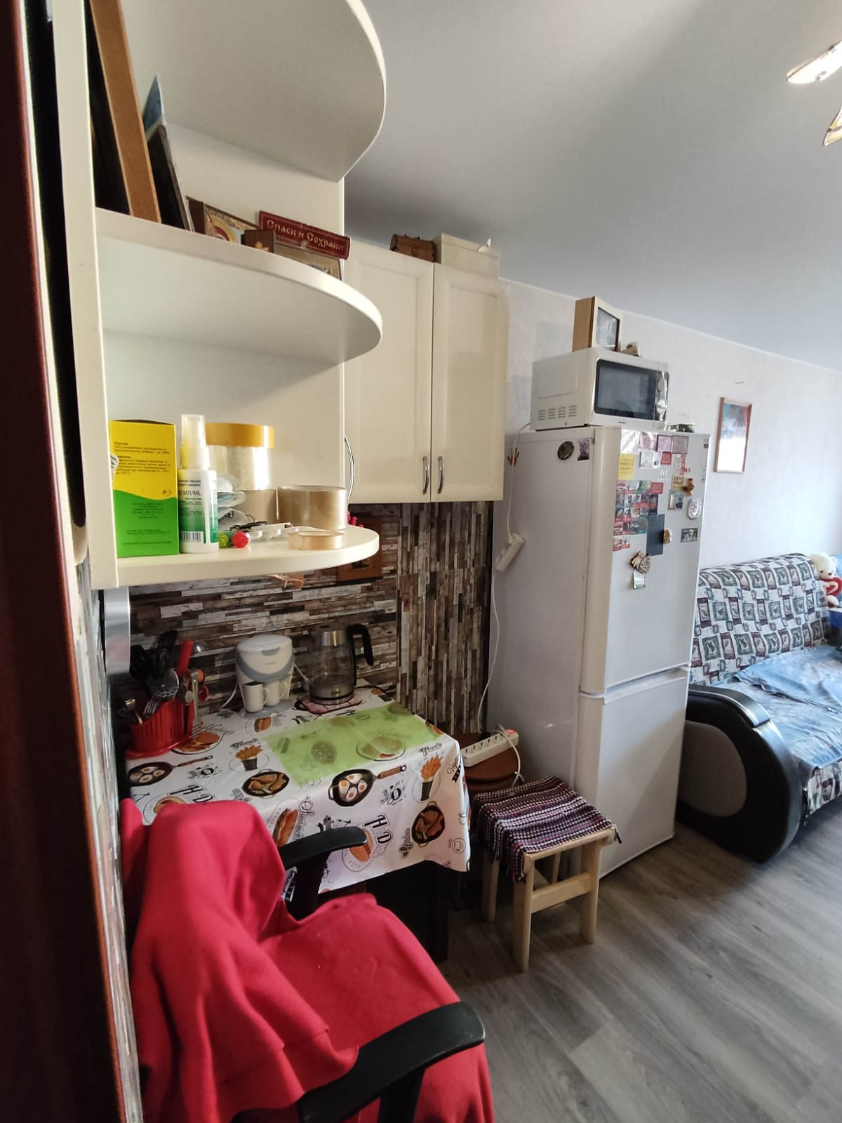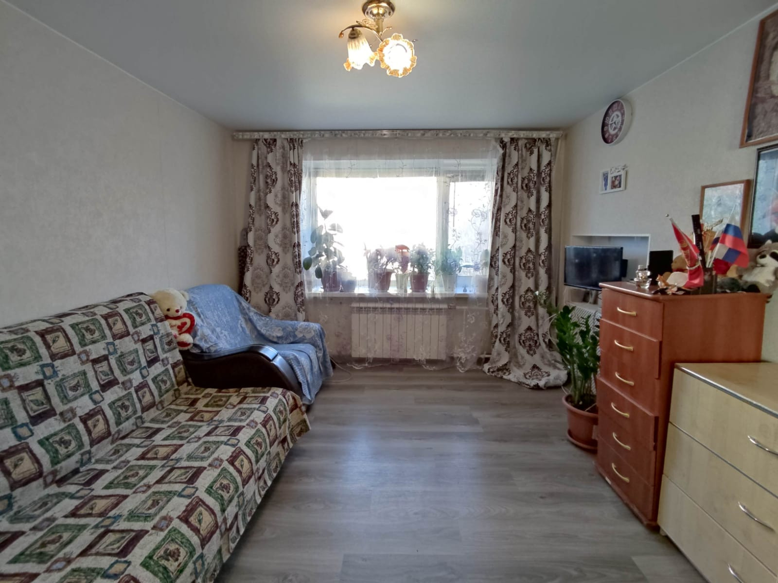 В комнате сделан косметический ремонт: установлено пластиковое окно, на полу ламинат, натяжной потолок, стены выровнены. Остается встроенная кухня. Соседи спокойные.