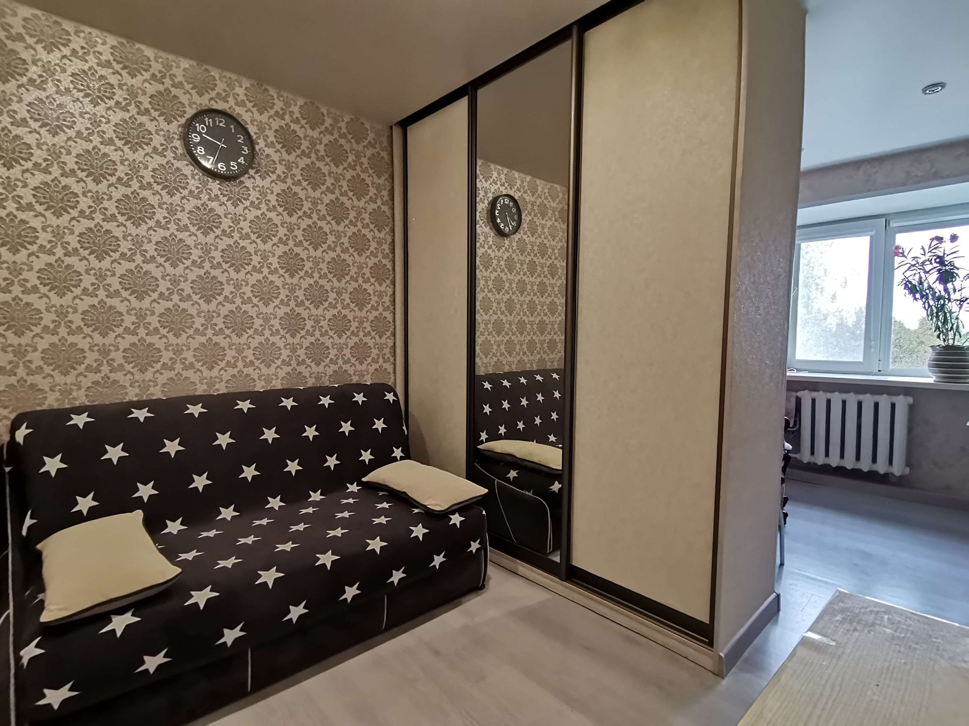 Продам большую комнату. Состояние хорошее, сделан ремонт.  Проводка новая, двухтарифный счётчик, ламинат, натяжной потолок. Остается один диван, рабочий стол, кухонный стол, шкаф купе, холодильник, микроволновка. В коридоре остается шкаф-гардероб. Можно заехать и жить или сразу сдать в аренду.