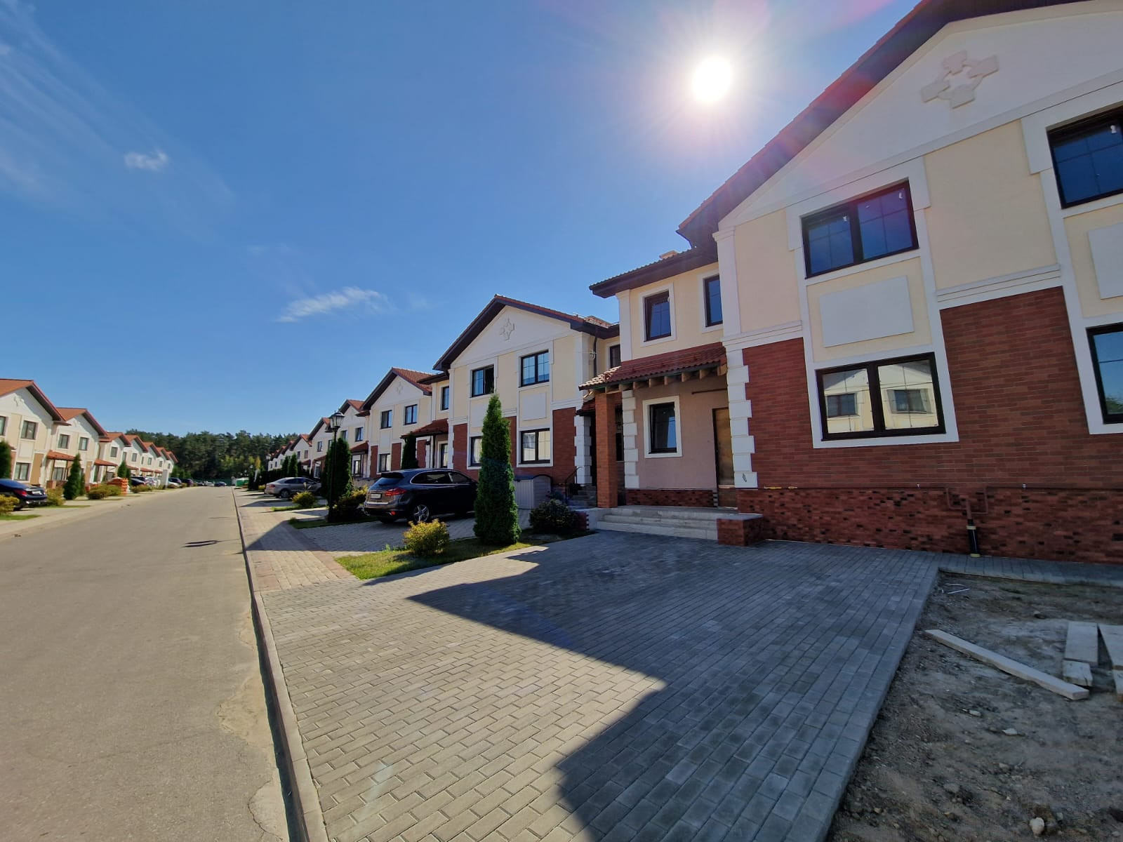 Центральные коммуникации (Газ, вода, канализация, электричество), никто не прописан, куплен у застройщика за собственные средства без ипотеки и мат. капитала. Парковка на брусчатке на 2 автомобиля.