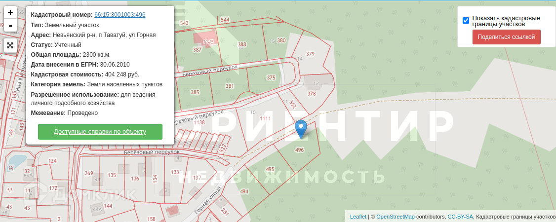 Кадастровый номер: 66:15:3001003:496 (номера участков на кадастровом плане 495 и 496)