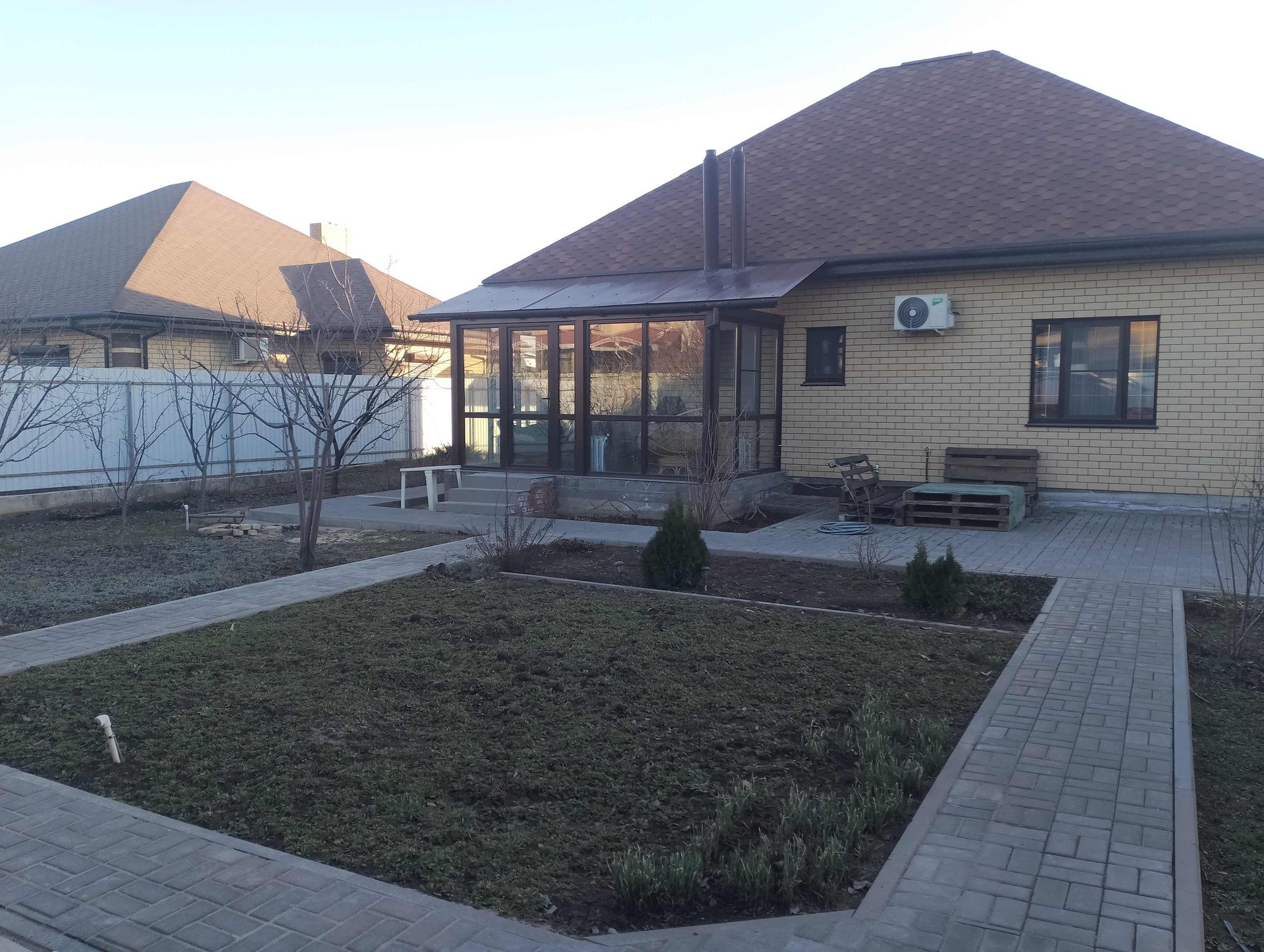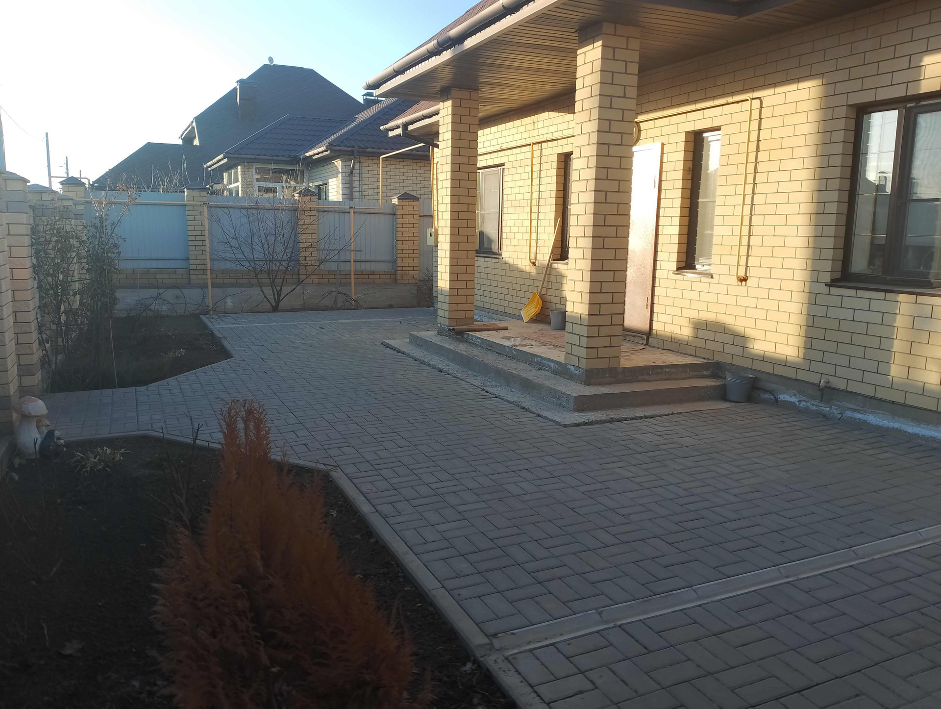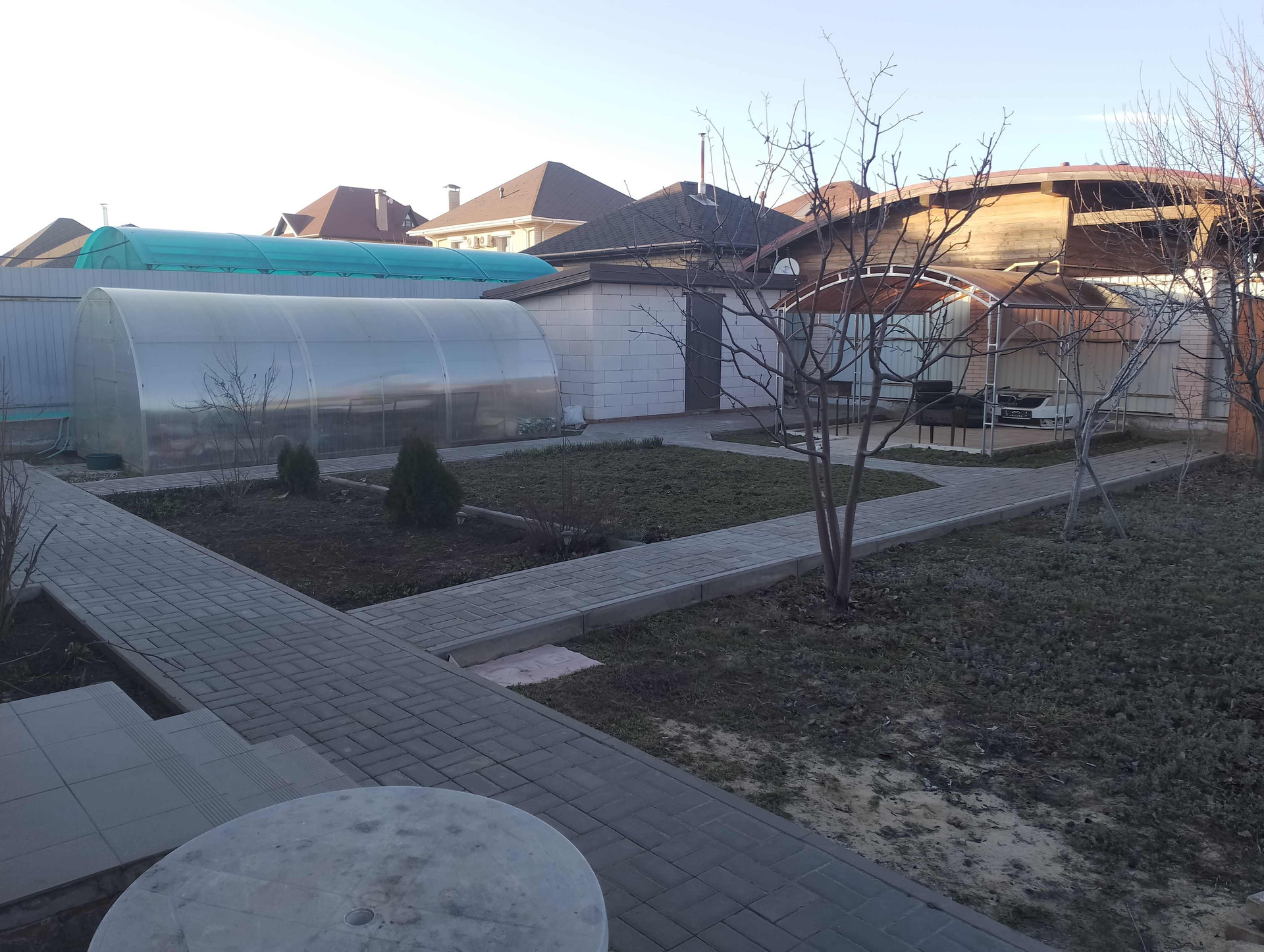 На участке плодородные деревья, теплица, огород, беседка, сарай с погребом, а также навес для машины с автоматическими воротами, на улице ещё три парковочных места, уложенных брусчаткой.