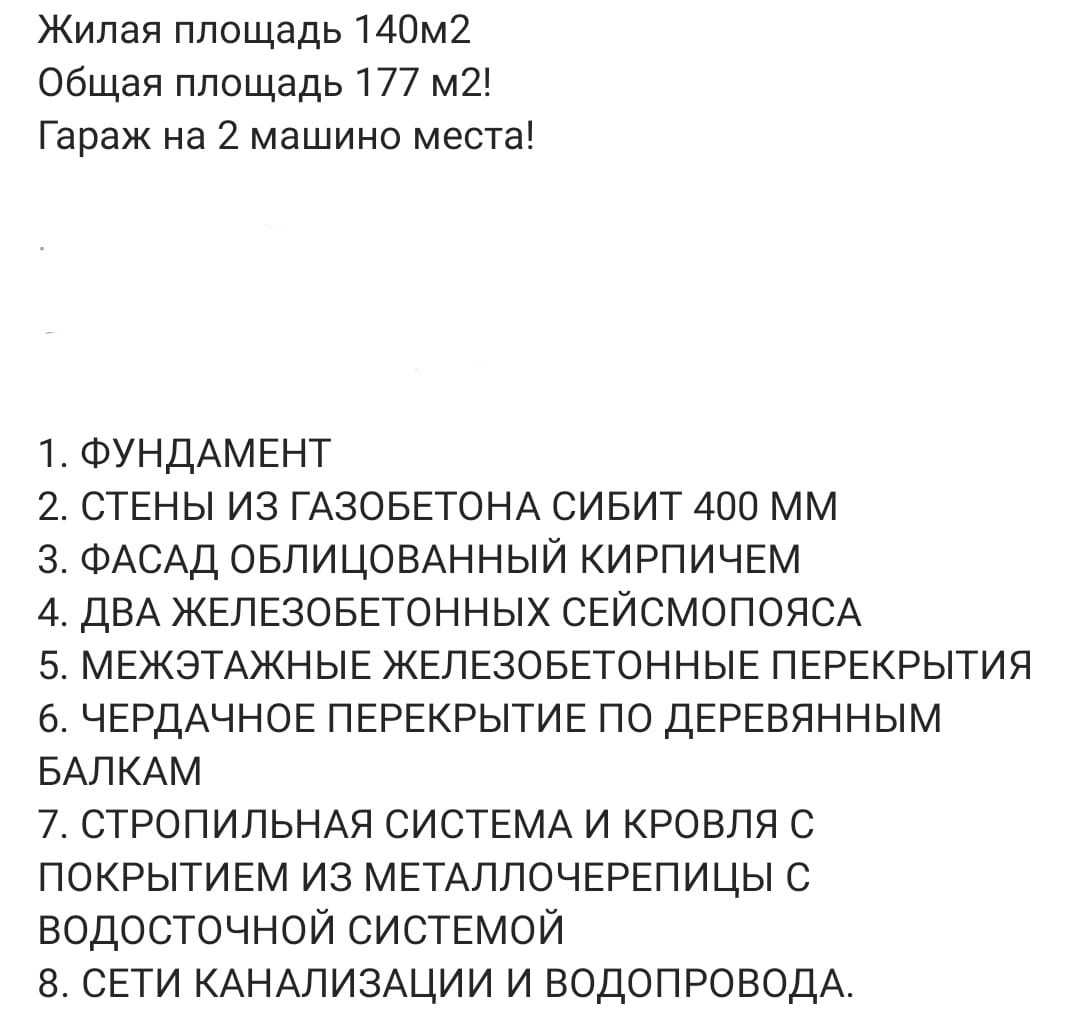 Продам дом 90% готовности. Дом построен из качественных и дорогостоящих материалов: стены из газобетона (сибит) 400 мм, фасад облицован кирпичом, крыша- металлочерепица с водосточной системой. Так как дом строили для себя, всё продумано до мелочей: фундамент, два железобетонных сейсмопояса, межэтажные железобетонные перекрытия, чердачное перекрытие по деревянным балкам. Имеются фотографии поэтапного строения. Вода заведена в дом, газ на границе с участком, электричество – столб рядом с домом, счётчик на столбе имеется.