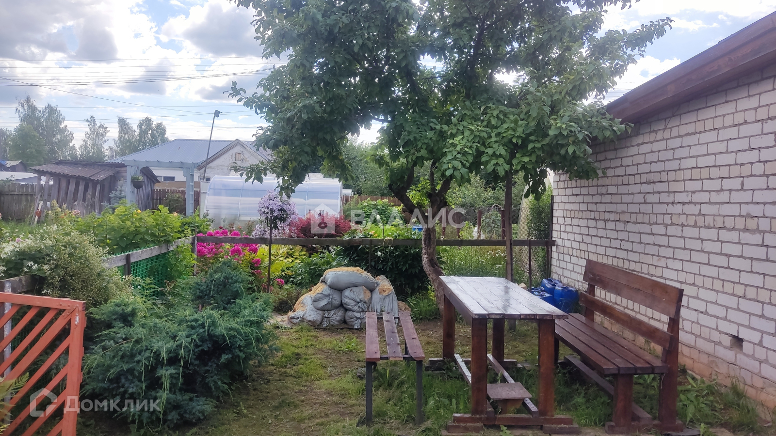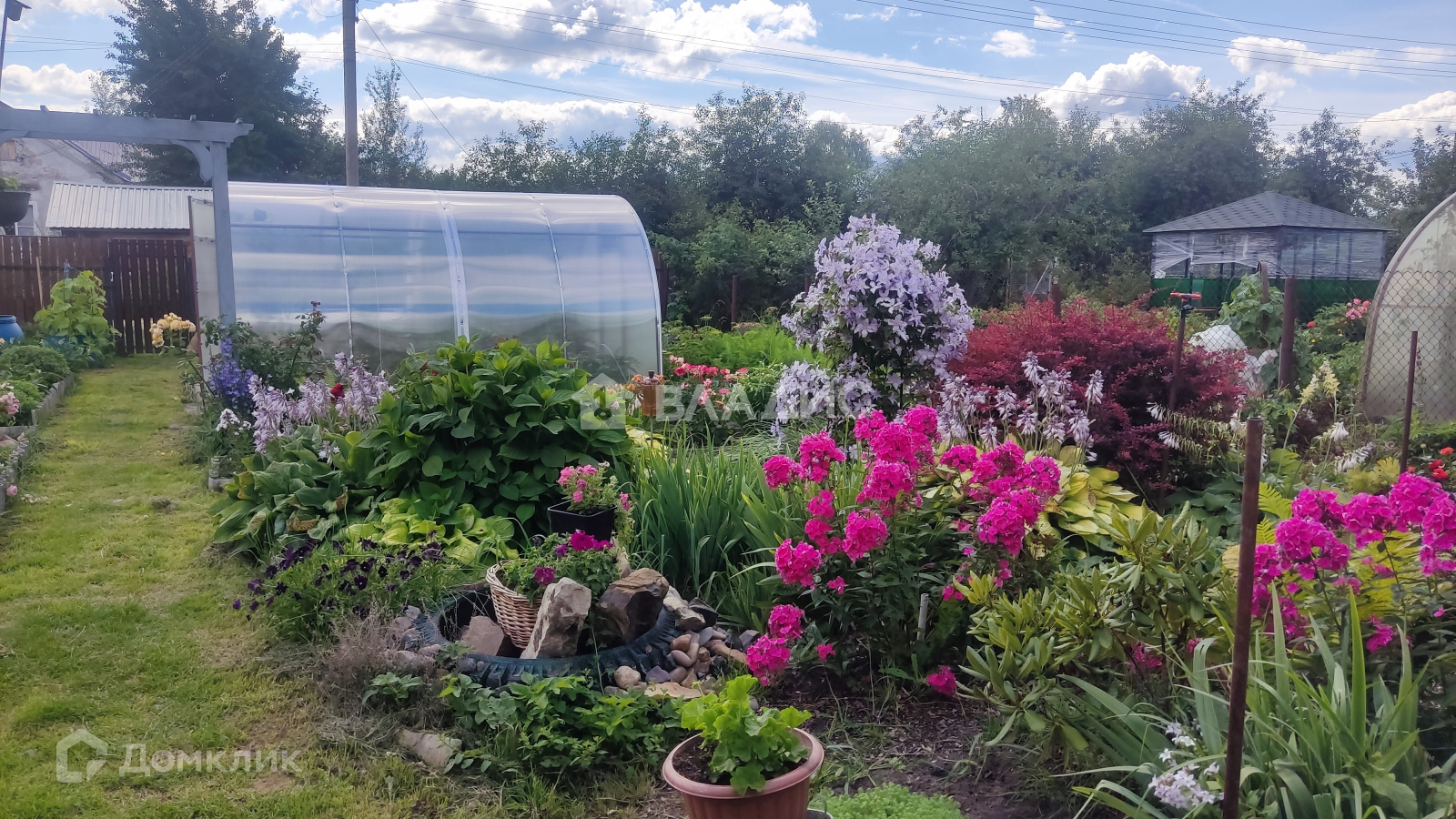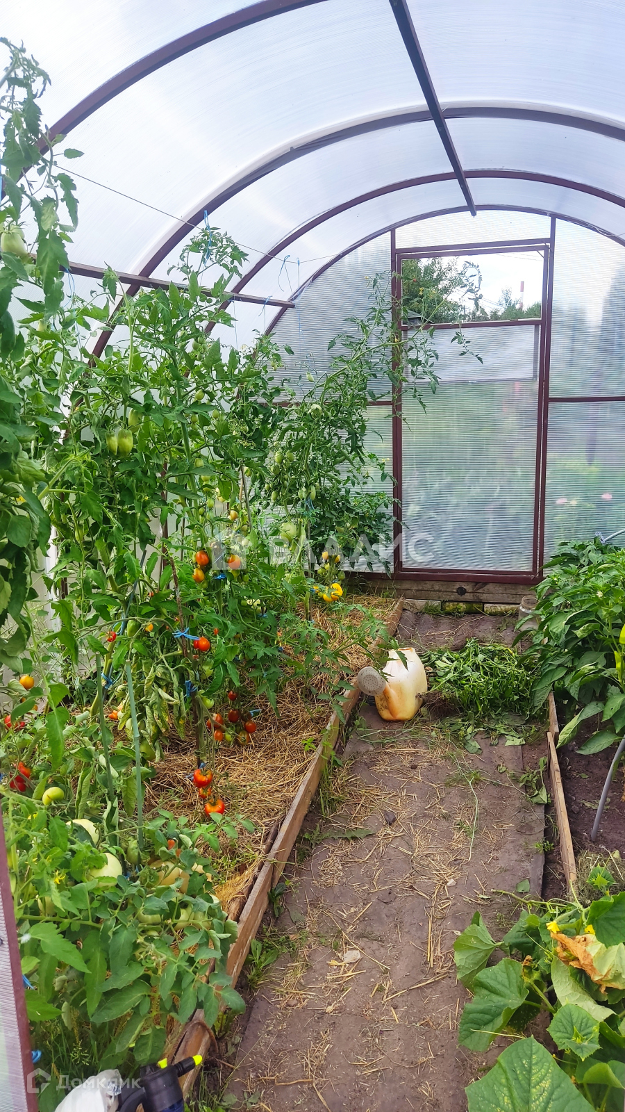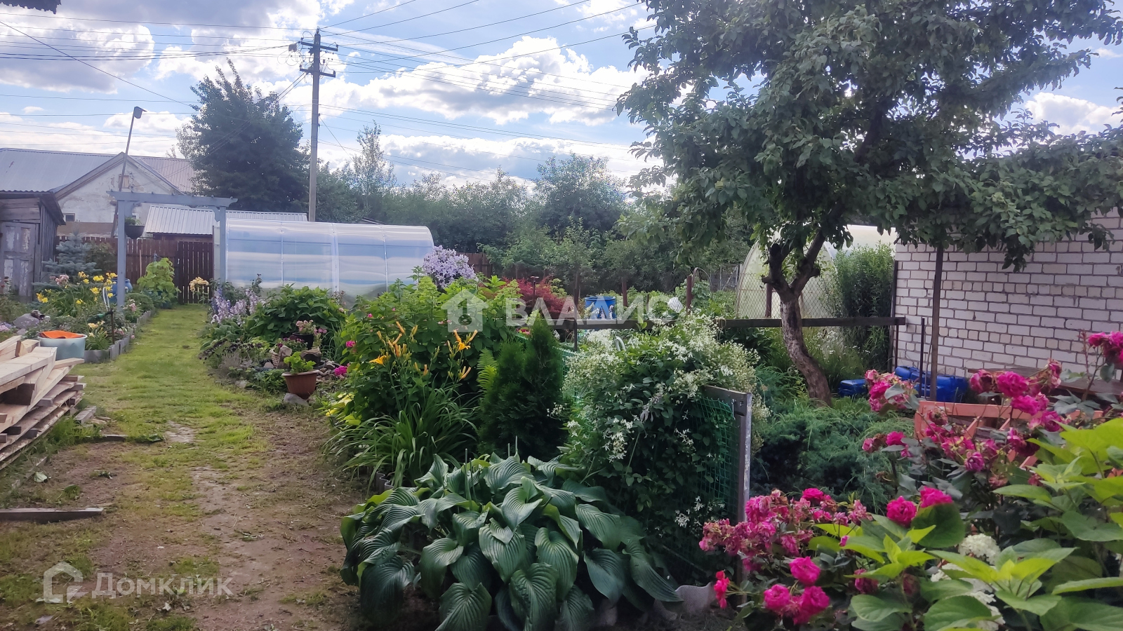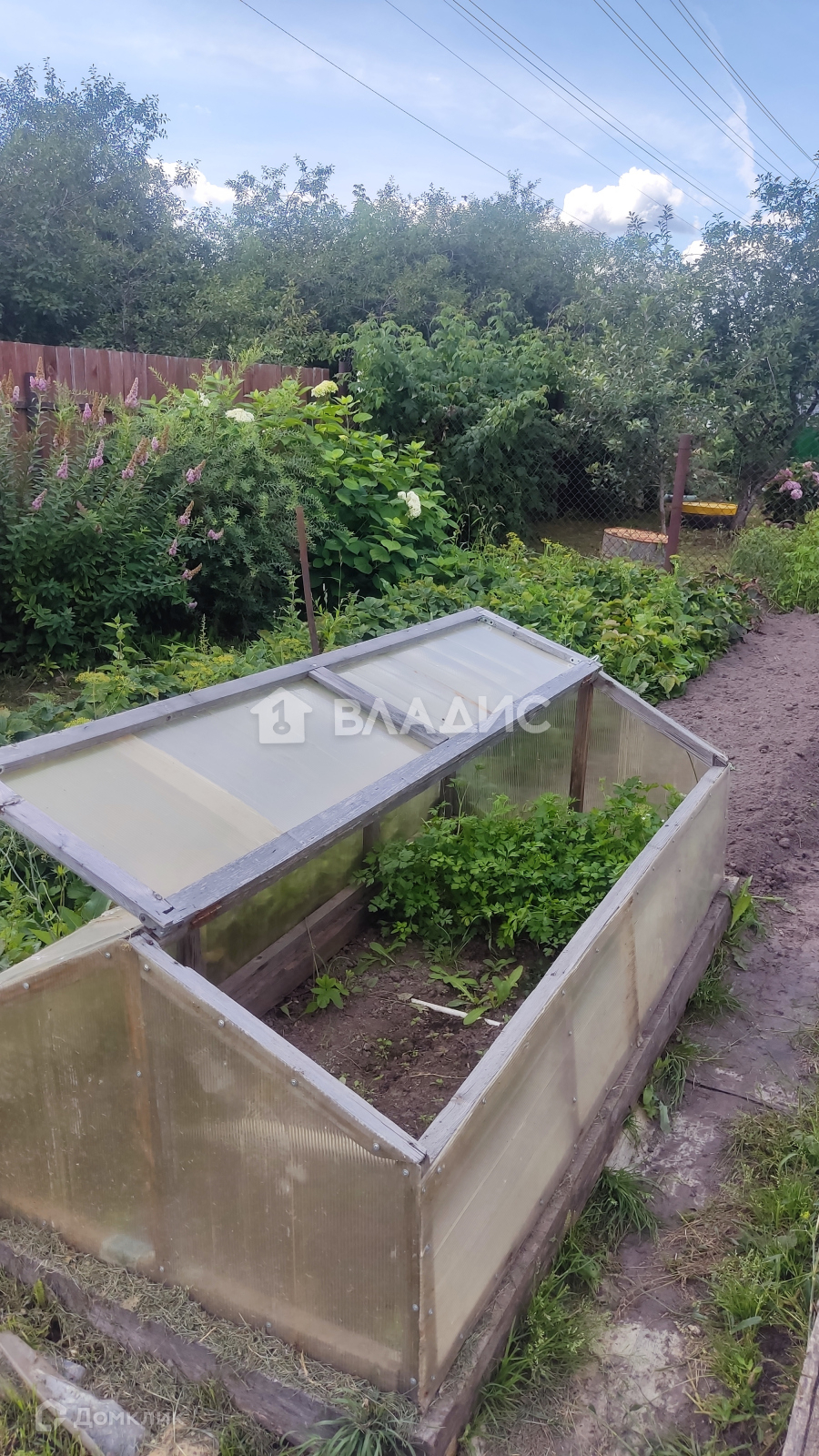 Земельный участок отмежован, на нем установлена новая усиленная теплица и стационарный парник. Посажено много сортовых цветов и декоративных кустарников, жимолость, яблоня, клубника, есть обработанные грядки.