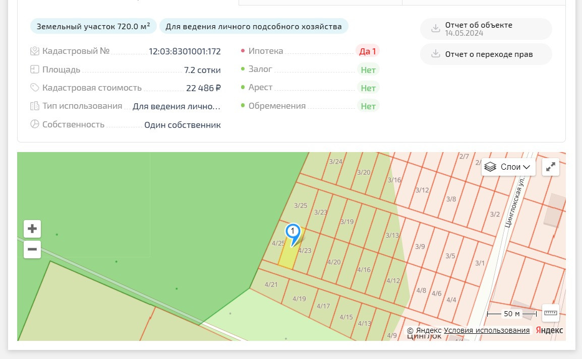 Земельный участок, площадь: 720 м2 , Кадастровый номер: 12:03:8301001:172, Категория земель: Земли населенных пунктов, Вид разрешенного использования: Приусадебный участок личного подсобного хозяйства