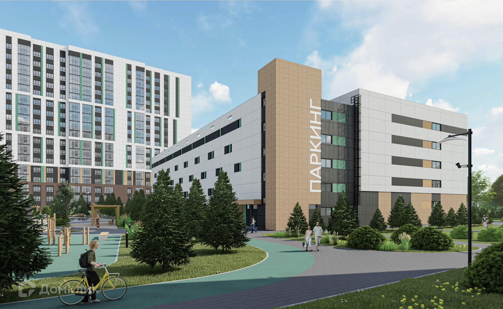 Пространство дворов отдано под места для отдыха, а также спортивные и детские площадки. Дворы свободны от машин: паркинги расположены в границах внутриквартальных проездов, ширина которых составляет 6 метров, кроме того, ещё организуют велопарковки.