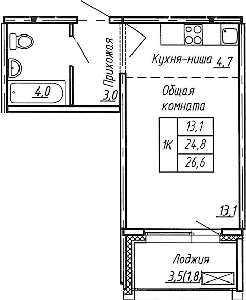 Общая площадь 26.6 м2