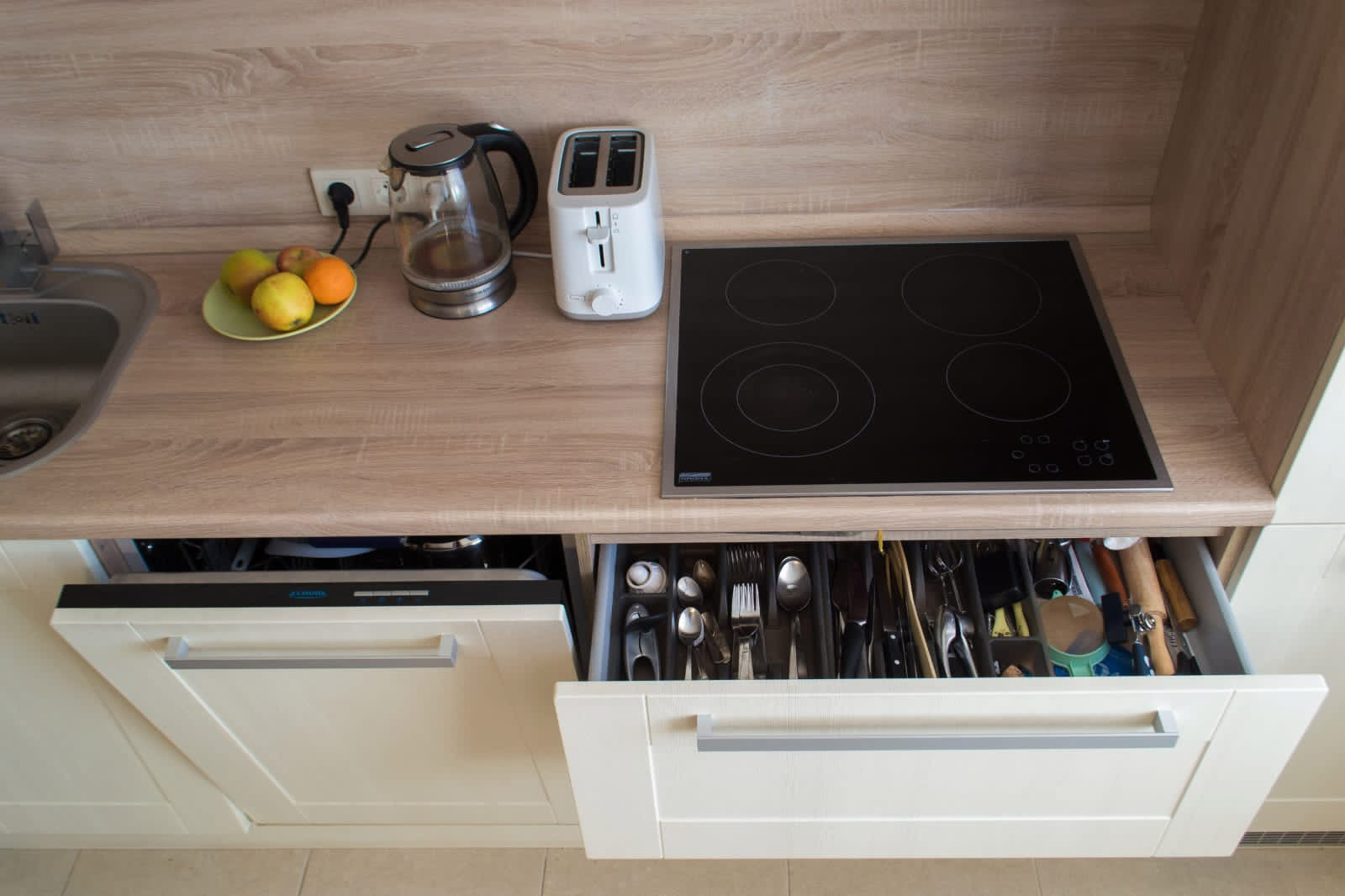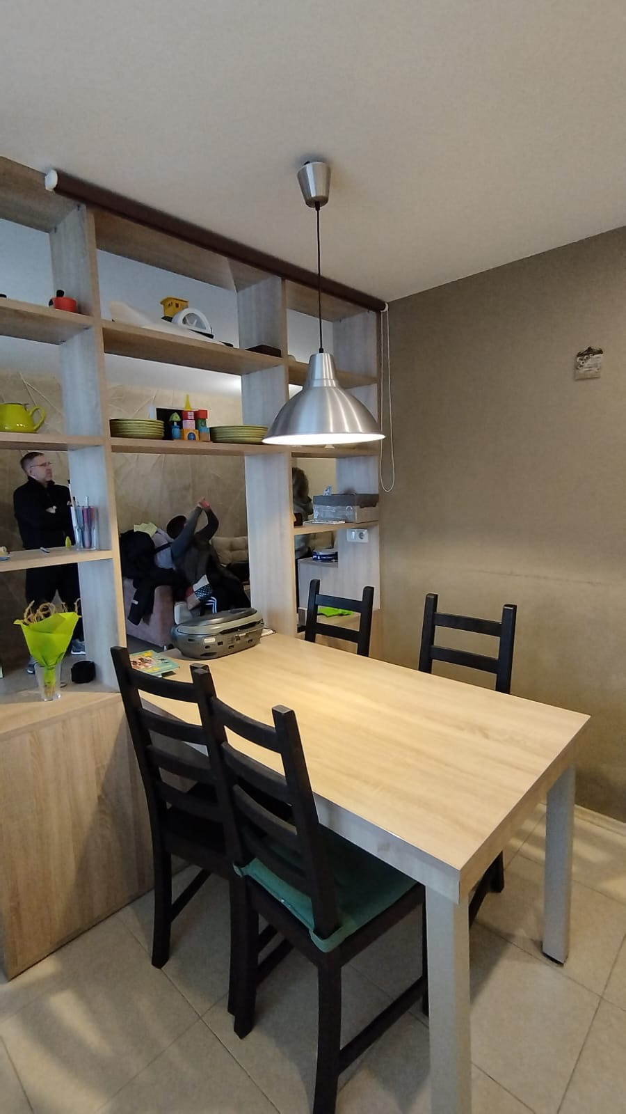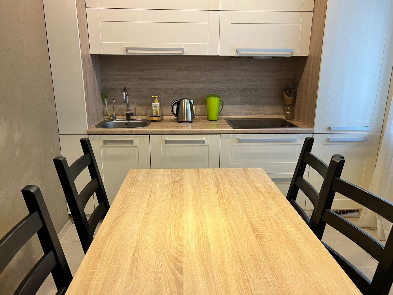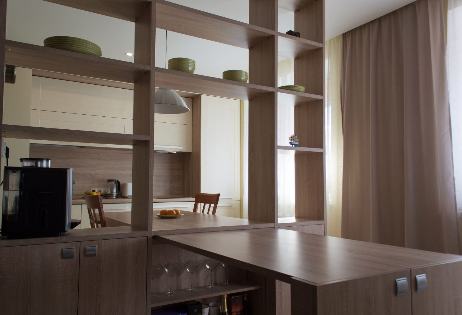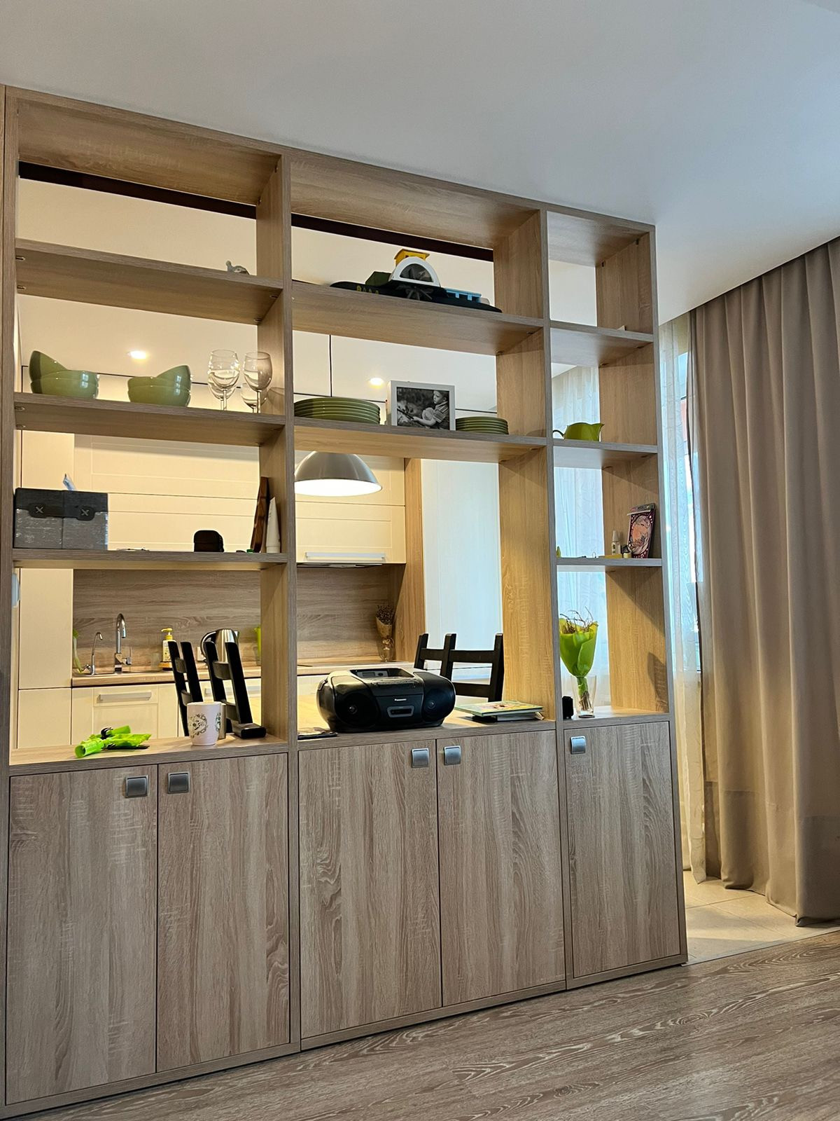 В комнате шкаф, диван, комод и красивая люстра. Пол - ламинат. Из спальни выход на лоджию и в кухню. Кухня и спальня разделены стеллажом, так же опускается рулонная штора. На кухне встроенная кухня, с варочной поверхностью и посудомойкой. Пол - плитка. Стол. Стулья. Есть фишка выдвижной стол, если придут гости. Под ним мини бар.