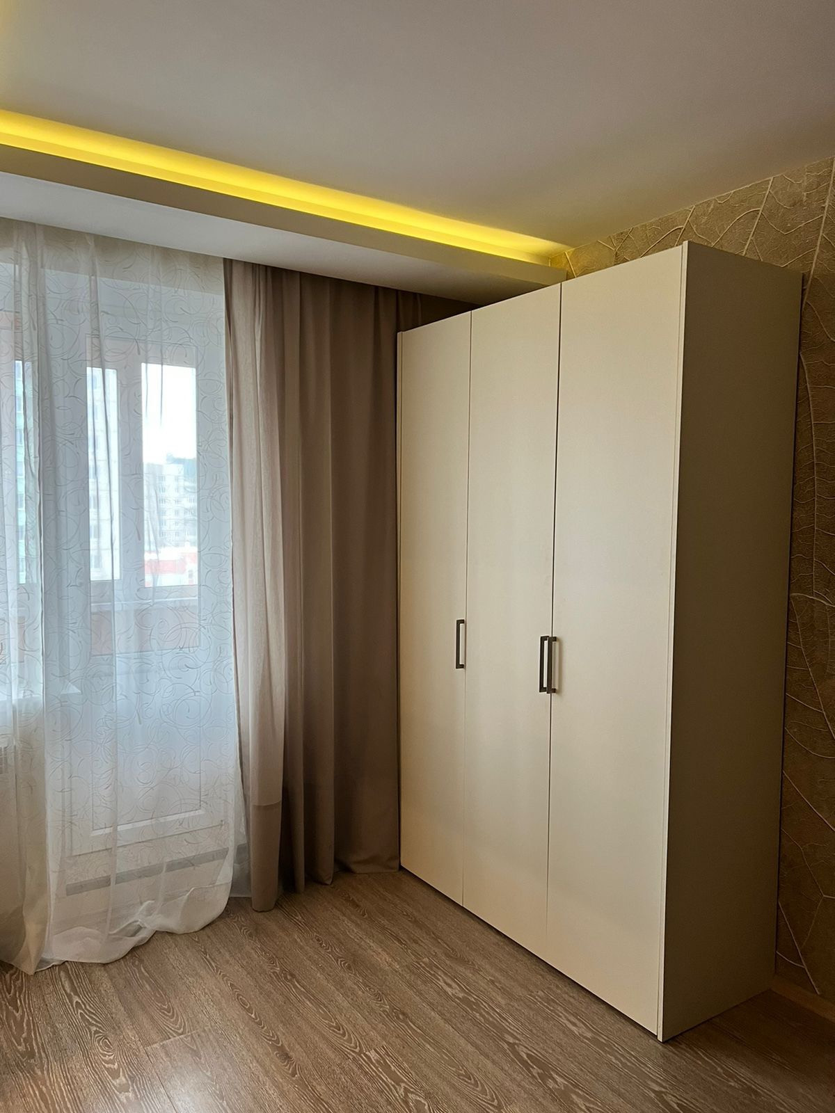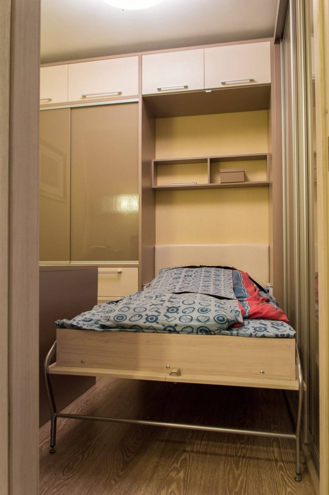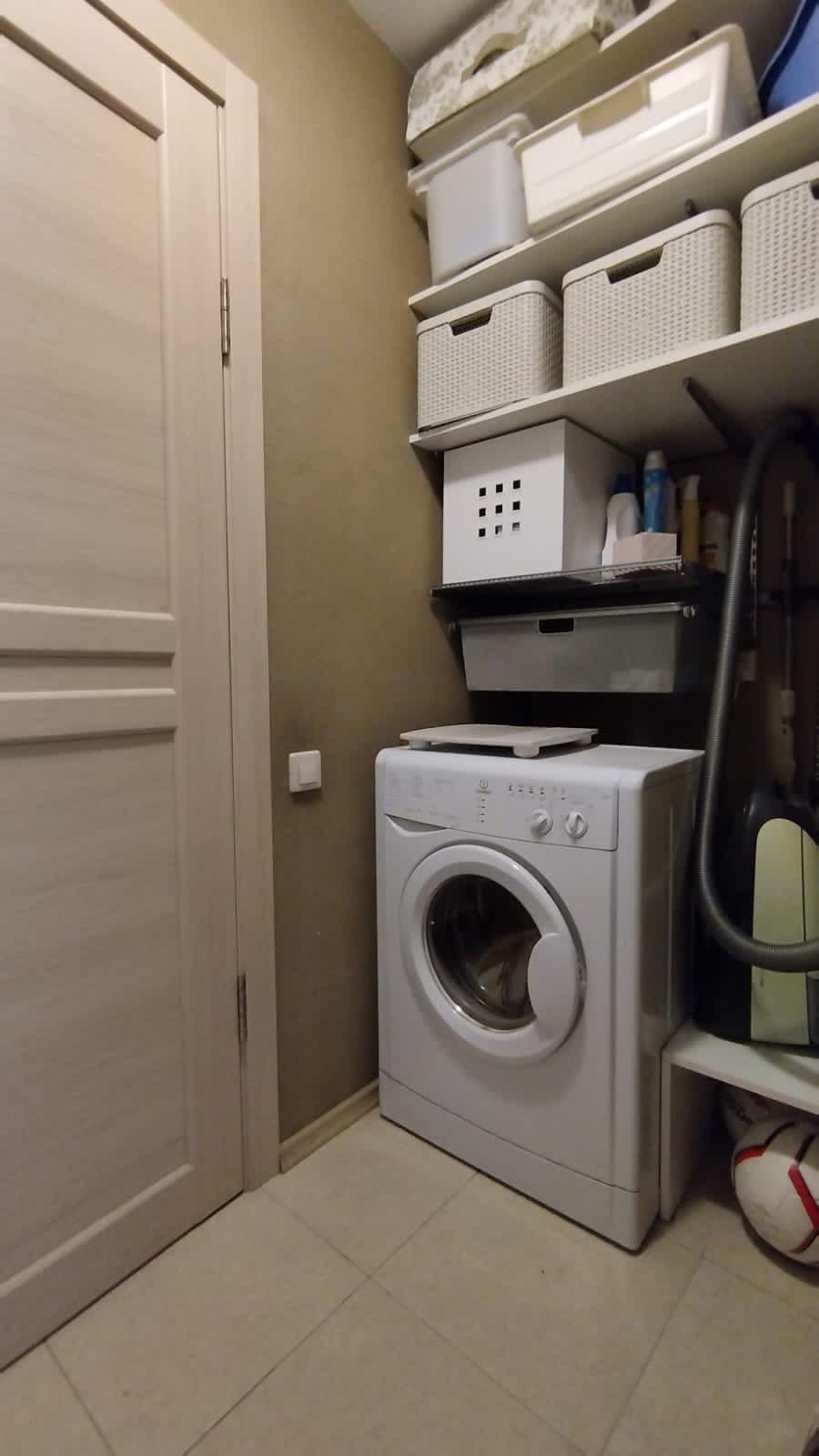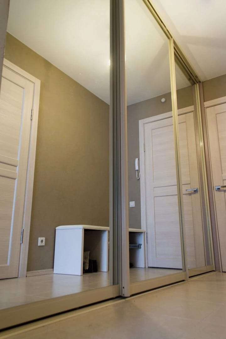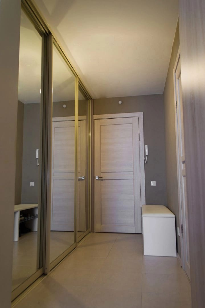 Попадаете в квартиру: в прихожей большой шкаф-купе с удобной встроенной обувницей. По левую руку кабинет/гардеробная/гостевая: есть место для хранения встроенный шкаф, стол, стул и откидная 1,5 спальная кровать. Три в одном. За гардеробной небольшое пространство, где так же встроенный шкаф, стиральная машина. Далее с/у, с ванной.
