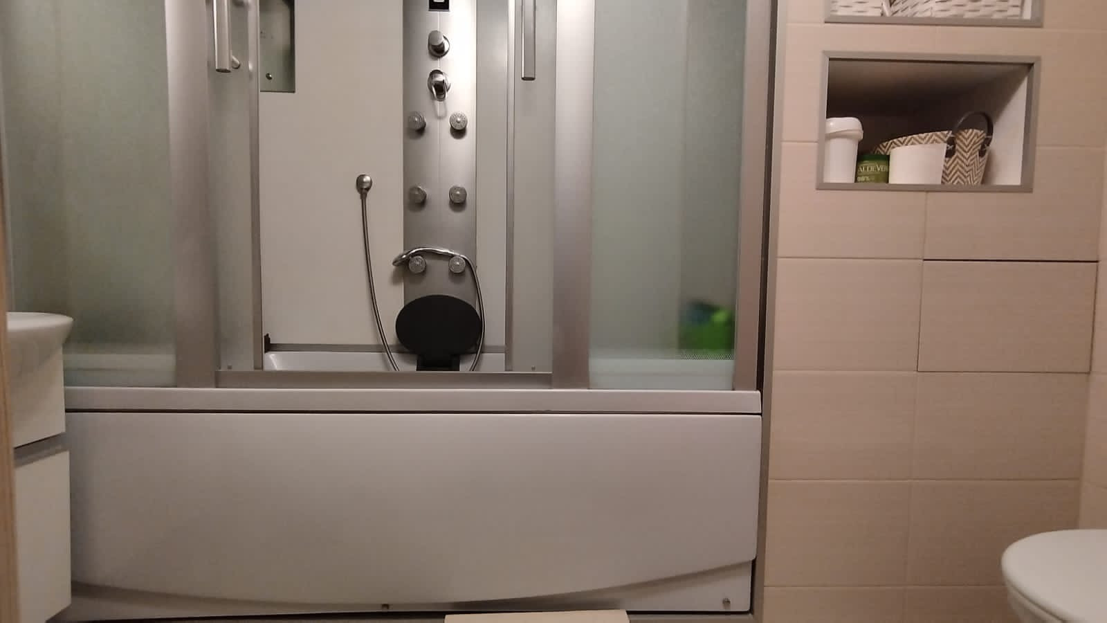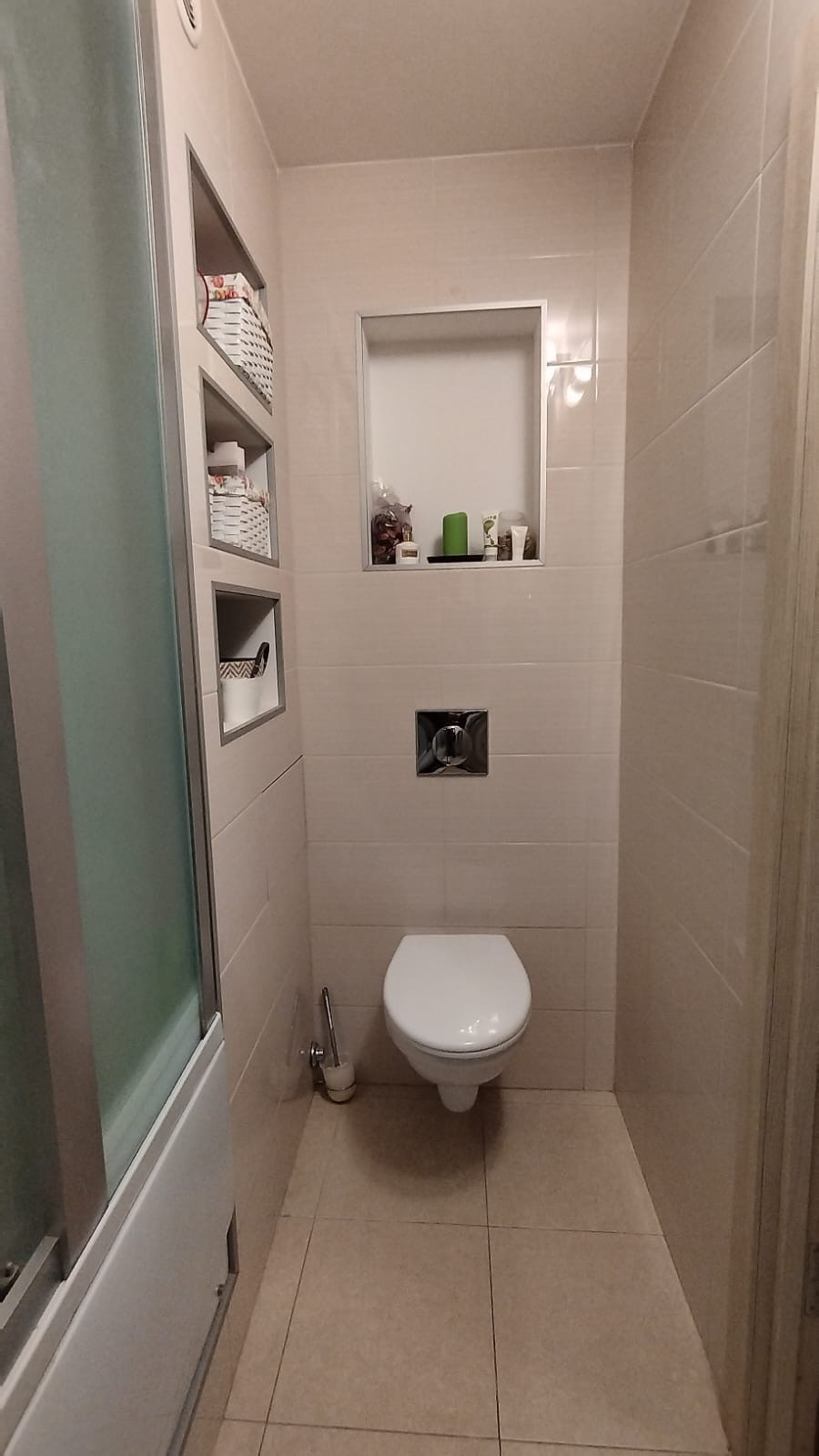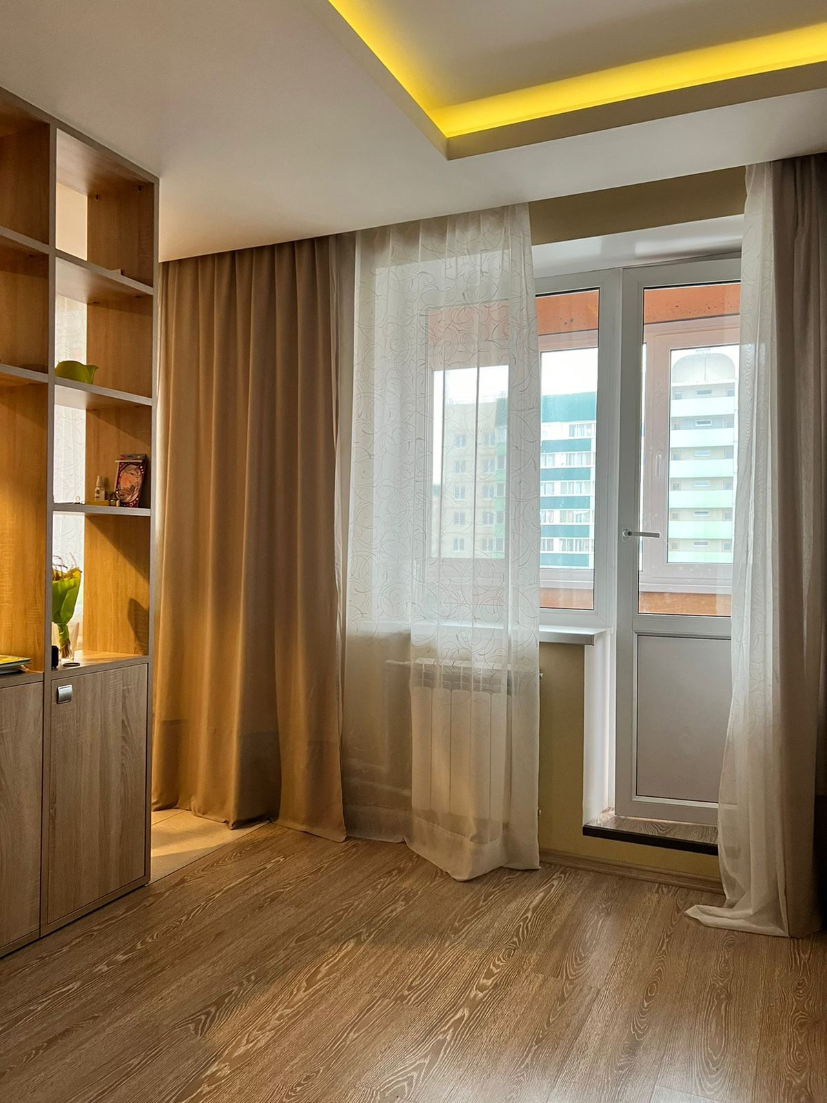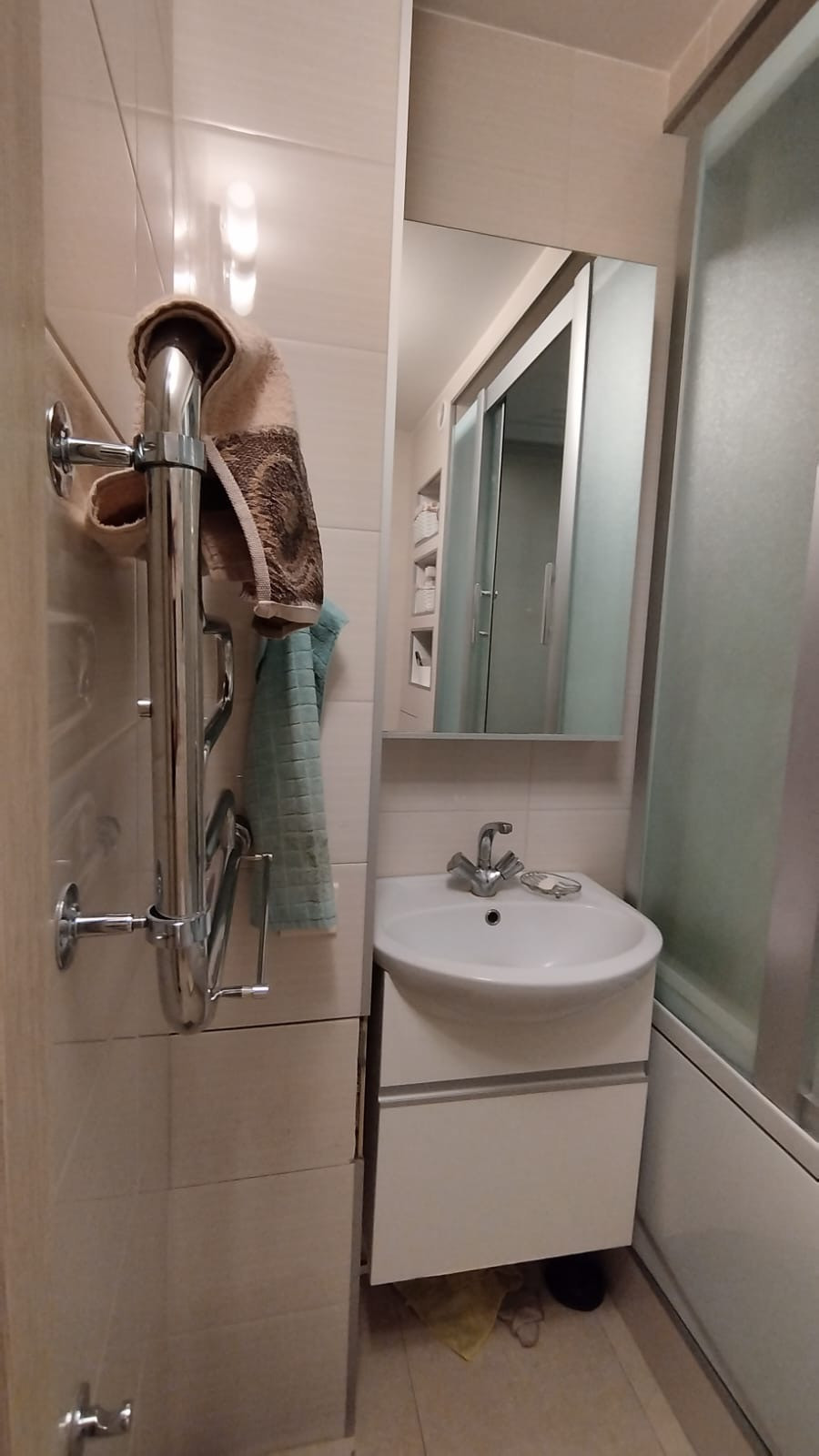 Попадаете в квартиру: в прихожей большой шкаф-купе с удобной встроенной обувницей. По левую руку кабинет/гардеробная/гостевая: есть место для хранения встроенный шкаф, стол, стул и откидная 1,5 спальная кровать. Три в одном. За гардеробной небольшое пространство, где так же встроенный шкаф, стиральная машина. Далее с/у, с ванной.