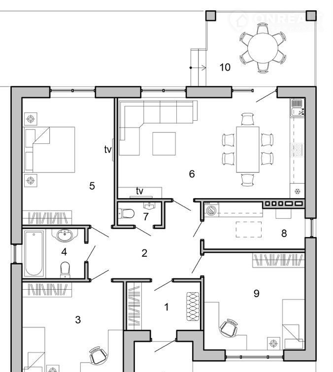 планировки на 3 жилые комнаты от 16м2, кухня-гостиная 30м2, большая ванна с окном, гостевой с/у, котельная/постирочная/кладовая 8м2, тамбур; монолитная, крытая терраса с выводом теплого пола, воды и света (веранда).