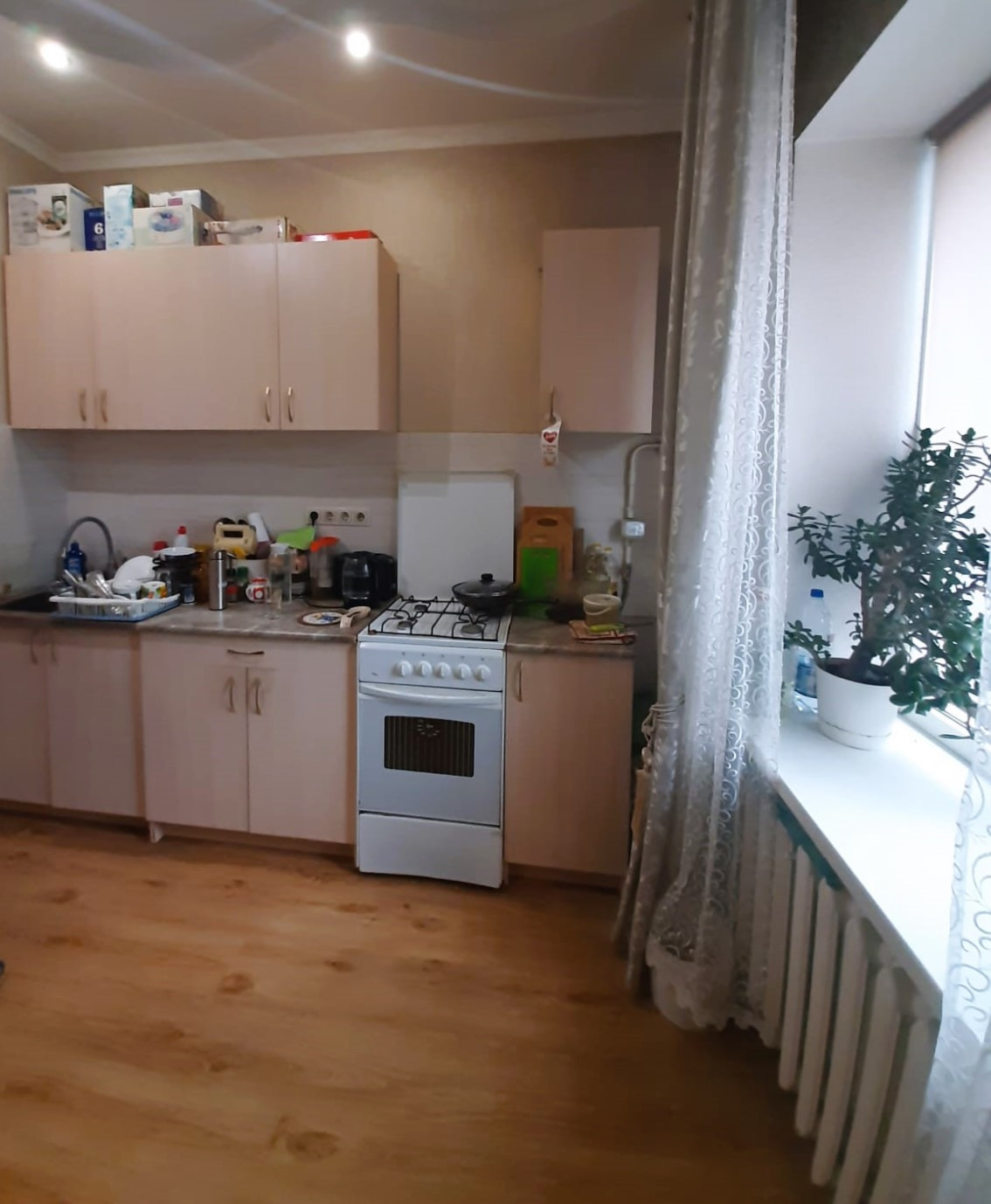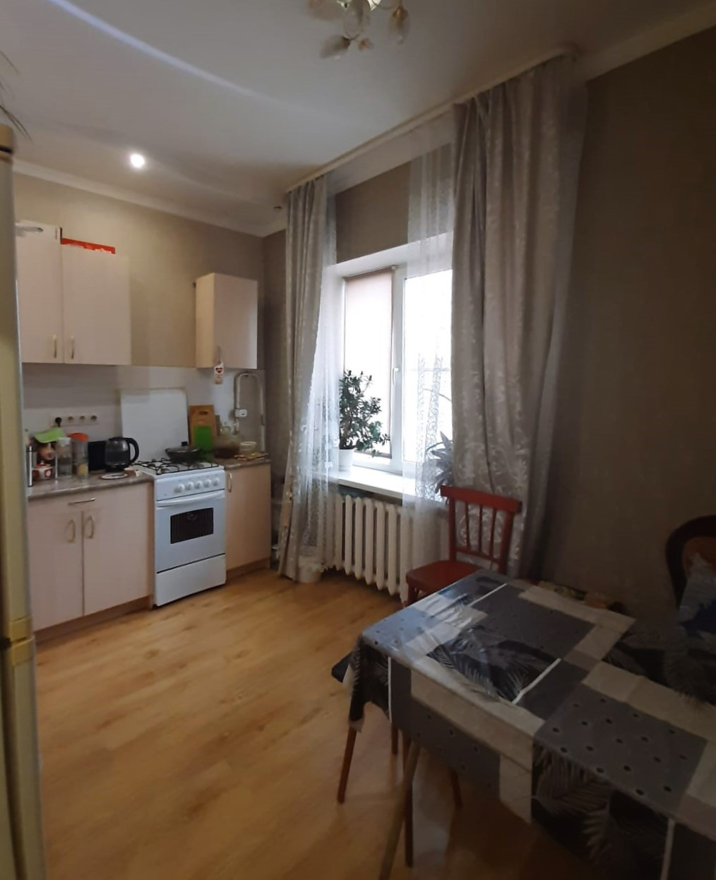 Просторная и светлая квартира общей площадью 55 м2. Комнаты смежные 20 м2 и 19 м2, кухня 10 м2. При ремонте использовались только качественные материалы, делалось для себя. Окна металлопластиковые, выходят во двор. Балкона нет. Санузел совмещенный, горячая вода – бойлер.