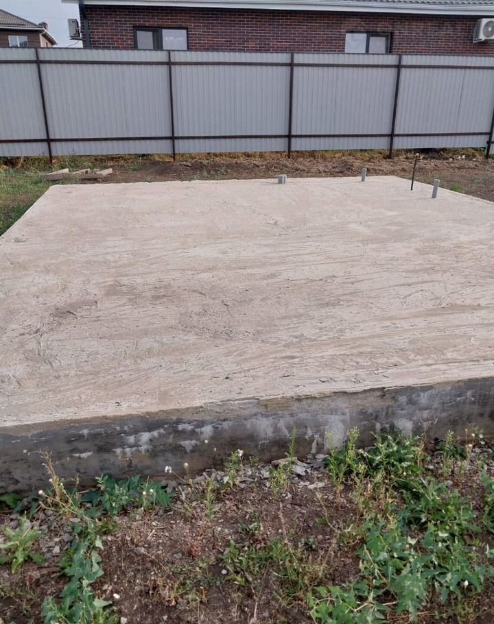 Фacадная чаcть залитa бетоном с металличеcкими oпорами под зaбор. Залит фундамент под маленький летний гостевой домик или баньку.