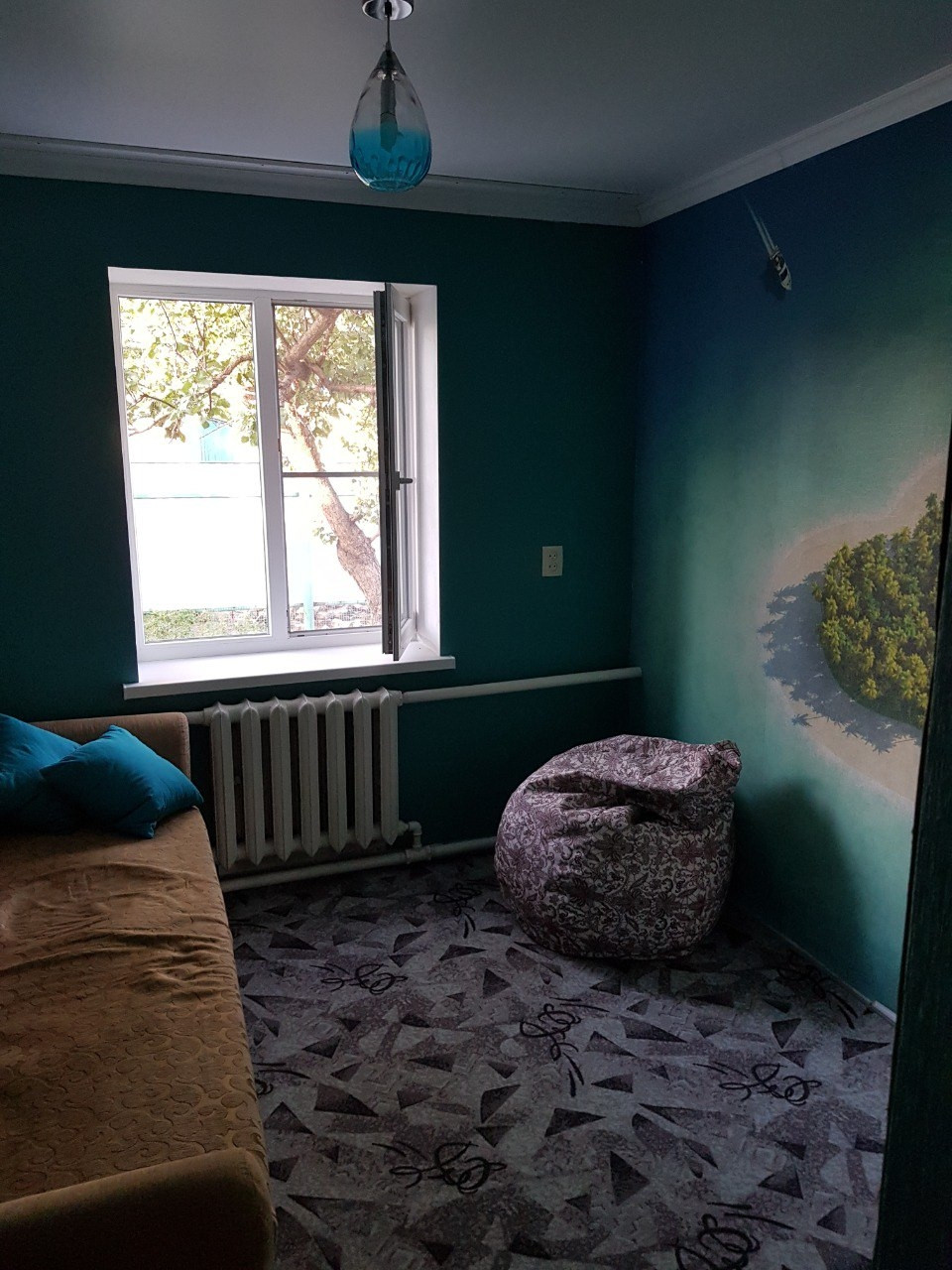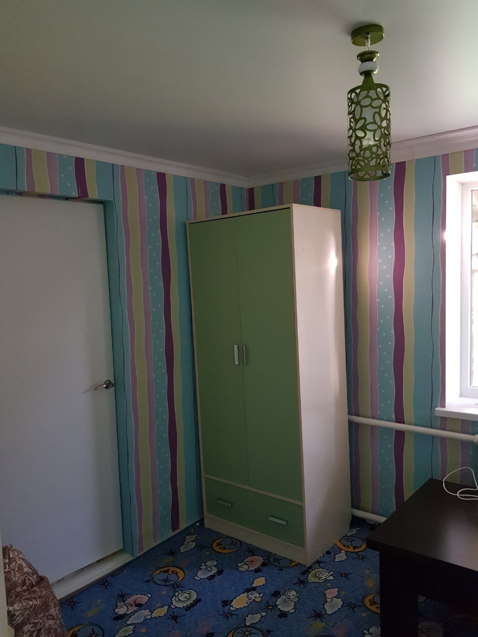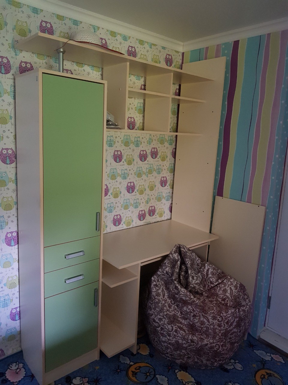 В детской комнате установлен диван, компьютерный стол и шкаф, и два мягких "пуфа-груши" и стол-трансформер, для семейных празднований.