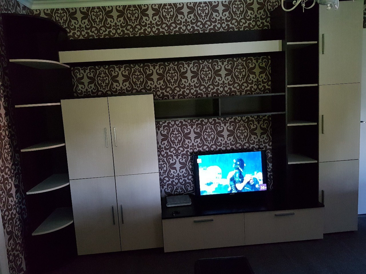 В зале большой диван и кресло, и большая стенка с нишей под телевизор и шкафчиками для хранения вещей первой необходимости.