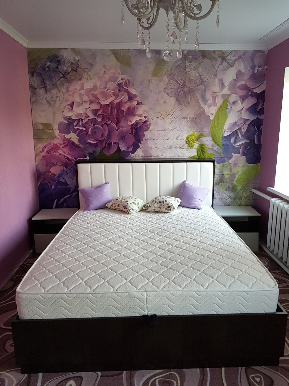 В спальне новая кровать, с подъемным механизмом и отделениями для хранения, две прикроватные тумбы, комод, два шкафа с зеркалом для вещей.