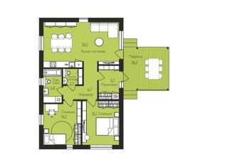Коттедж общей площадью 62,4 м2. Расположен в восточной очереди - ул. Котова Стоимость участка 2 740 000 рублей Гостиная с кухней - 29,7 м2; Спальня - 15,2 м2; Санузел - 7,8 м2 Коридор - 4 м2; Тамбур - 5,6 м2; Терраса - 18,2 м2. |