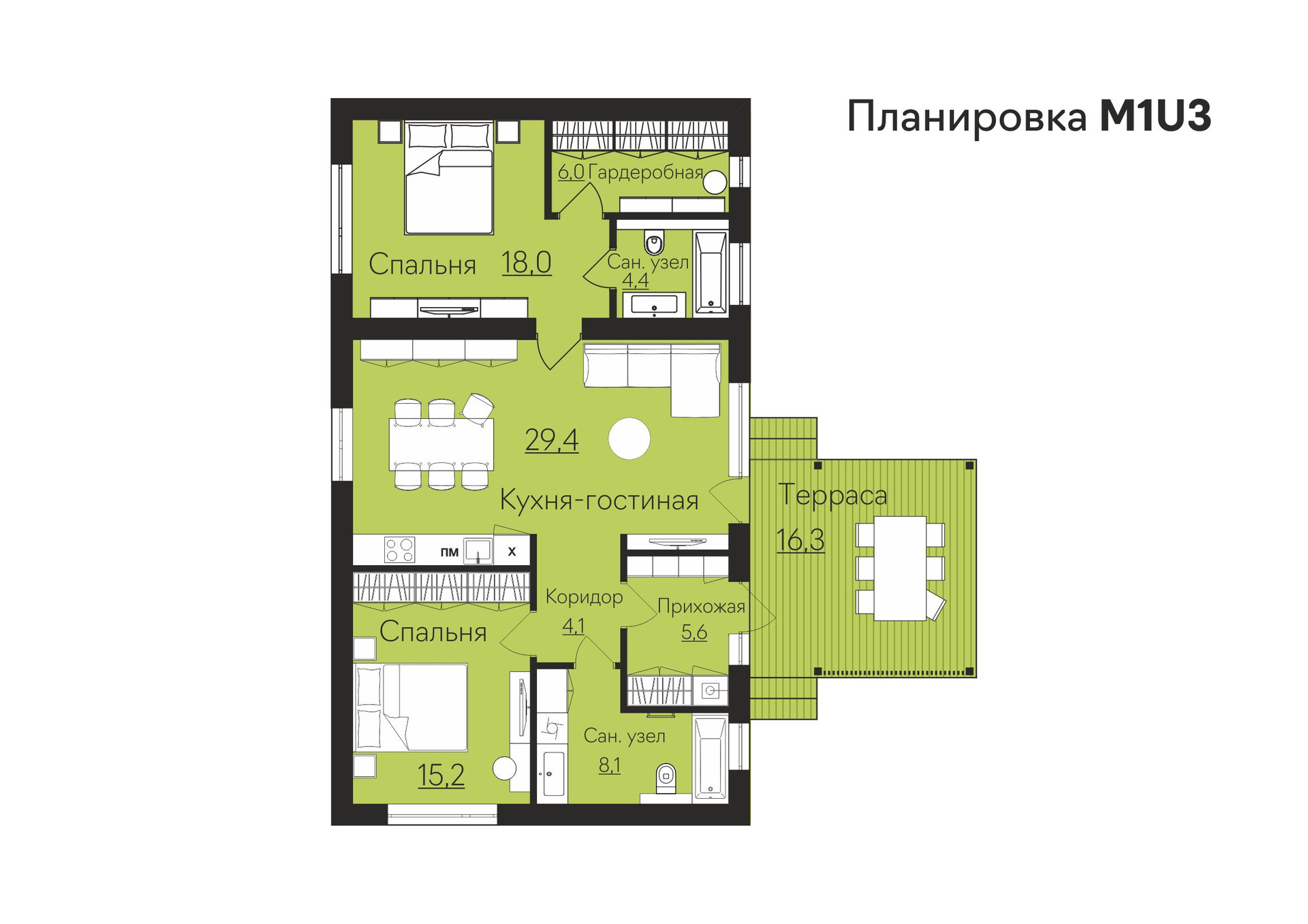 Гостиная с кухней - 29,4 м2;