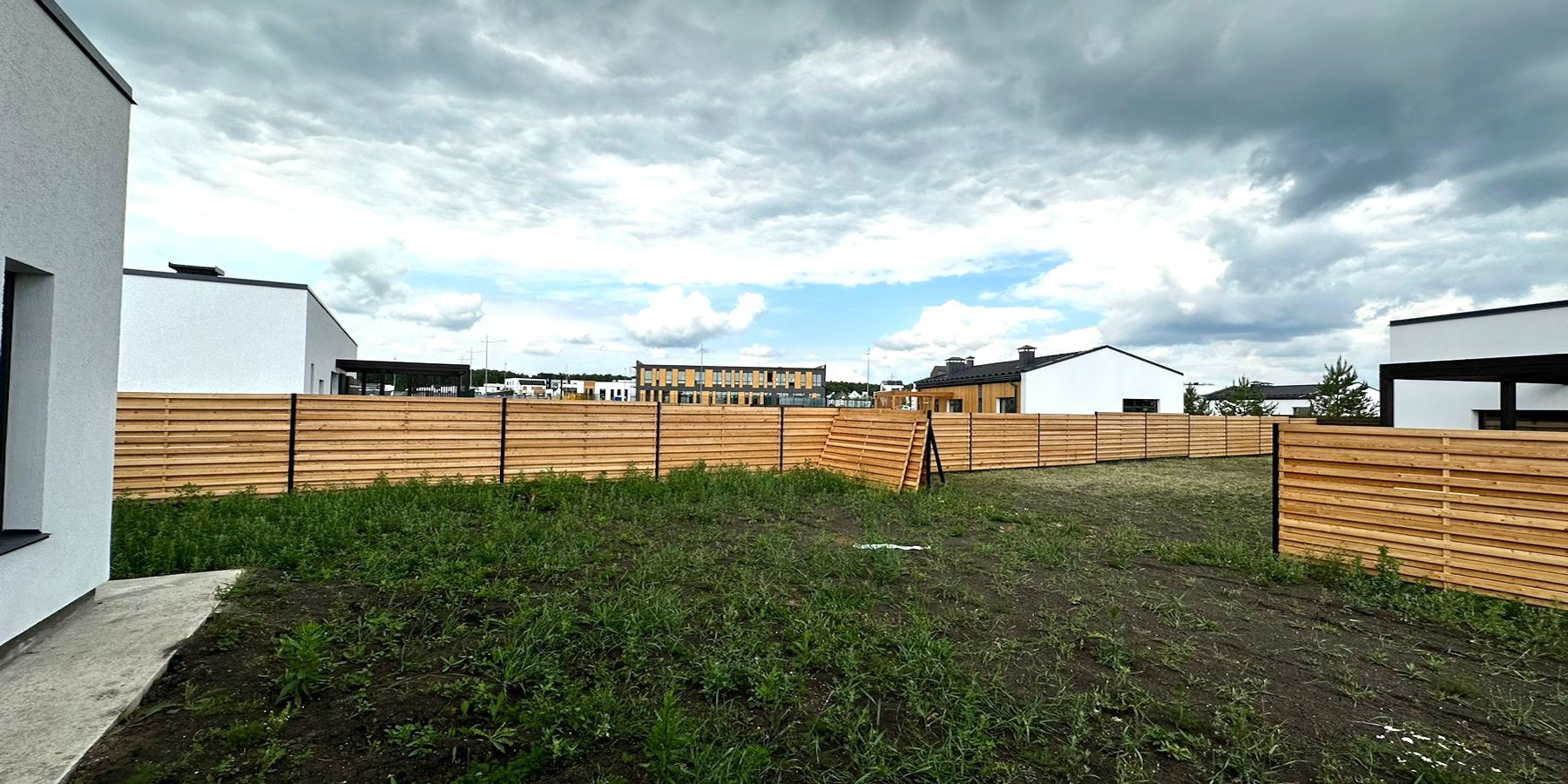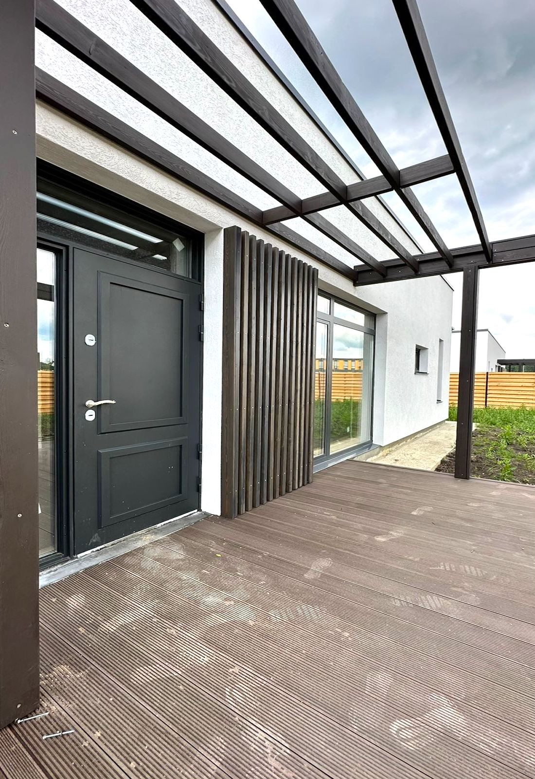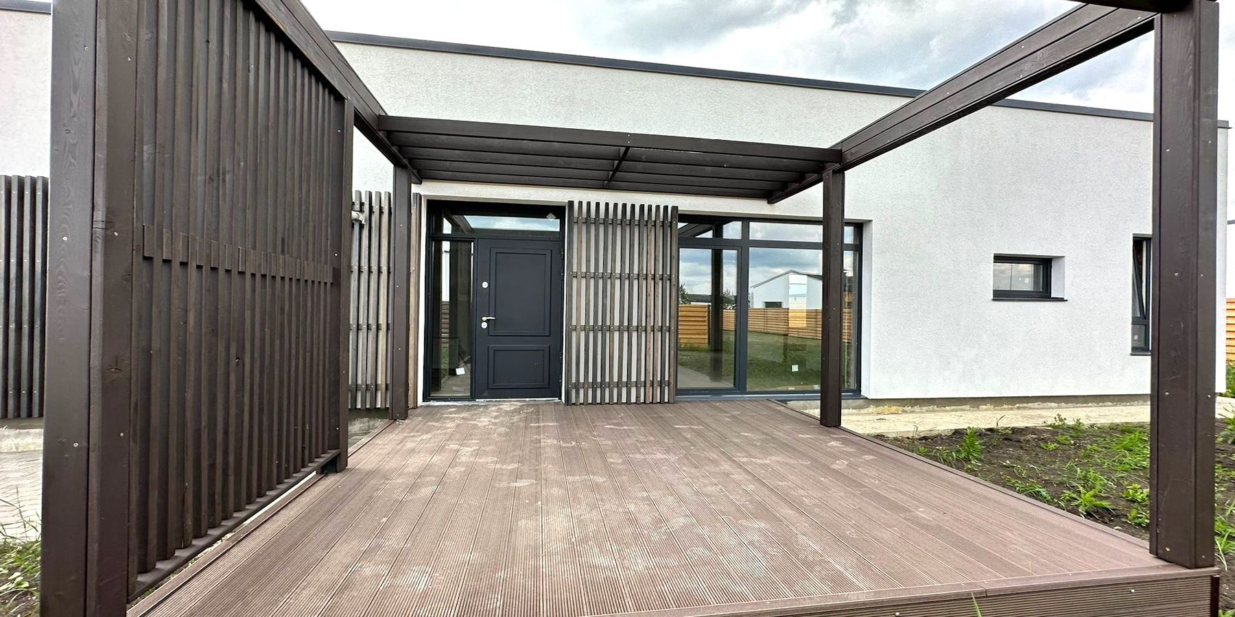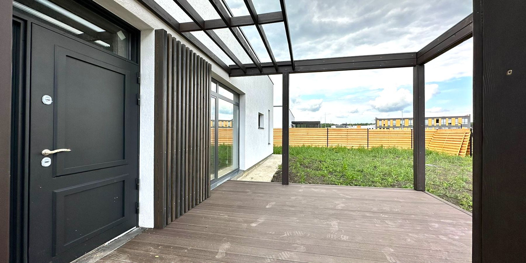 Дом одноэтажный, площадью 114,8 квадратных метров. Минималистичный фасад в скандинавском стиле. Собственный участок земли 5,5 соток с выделенной парковкой для двух автомобилей сразу у калитки.