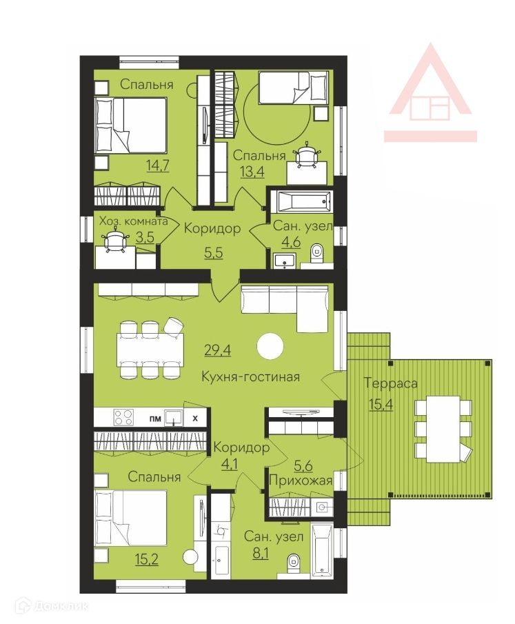 Планировка: студия + 3 спальни. Решение интересно тем, что общественная зона гостиная-кухня делит жилую зону на 2 части