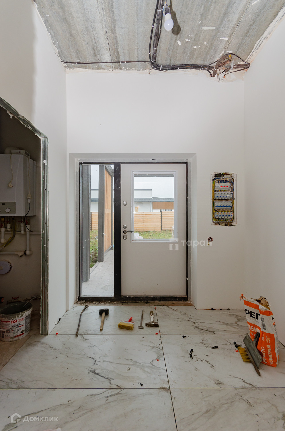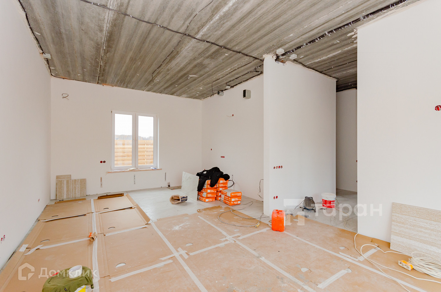 Частично с ремонтом. Выполнена большая часть работ, электрическая разводка по всему дому, выровнены, оштукатуренны и отшпаклёванны стены, можно наносить любое покрытие. Пол: керамогранит кухня- гостиная, коридор, ванная комната, санузел. Сделан тёплый пол.