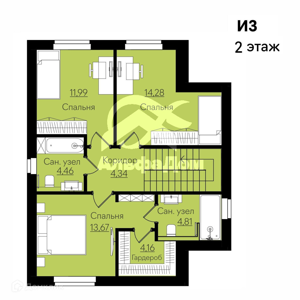 Две спальни - 11,9 м2, 14,28 м2;