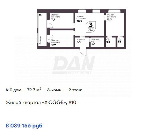 Квартира  72,7 квм плюс лоджия 8,1 квм, кухня-столовая 20 квм, лоджия 8 квм, 3 спальни, гадеробная, два санузла 4,4 и 3,5 квм.